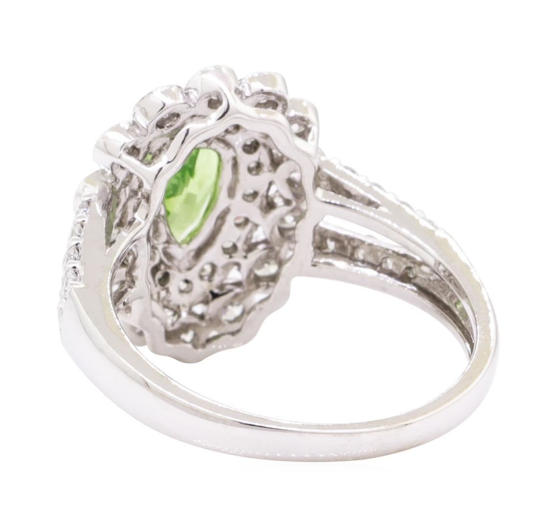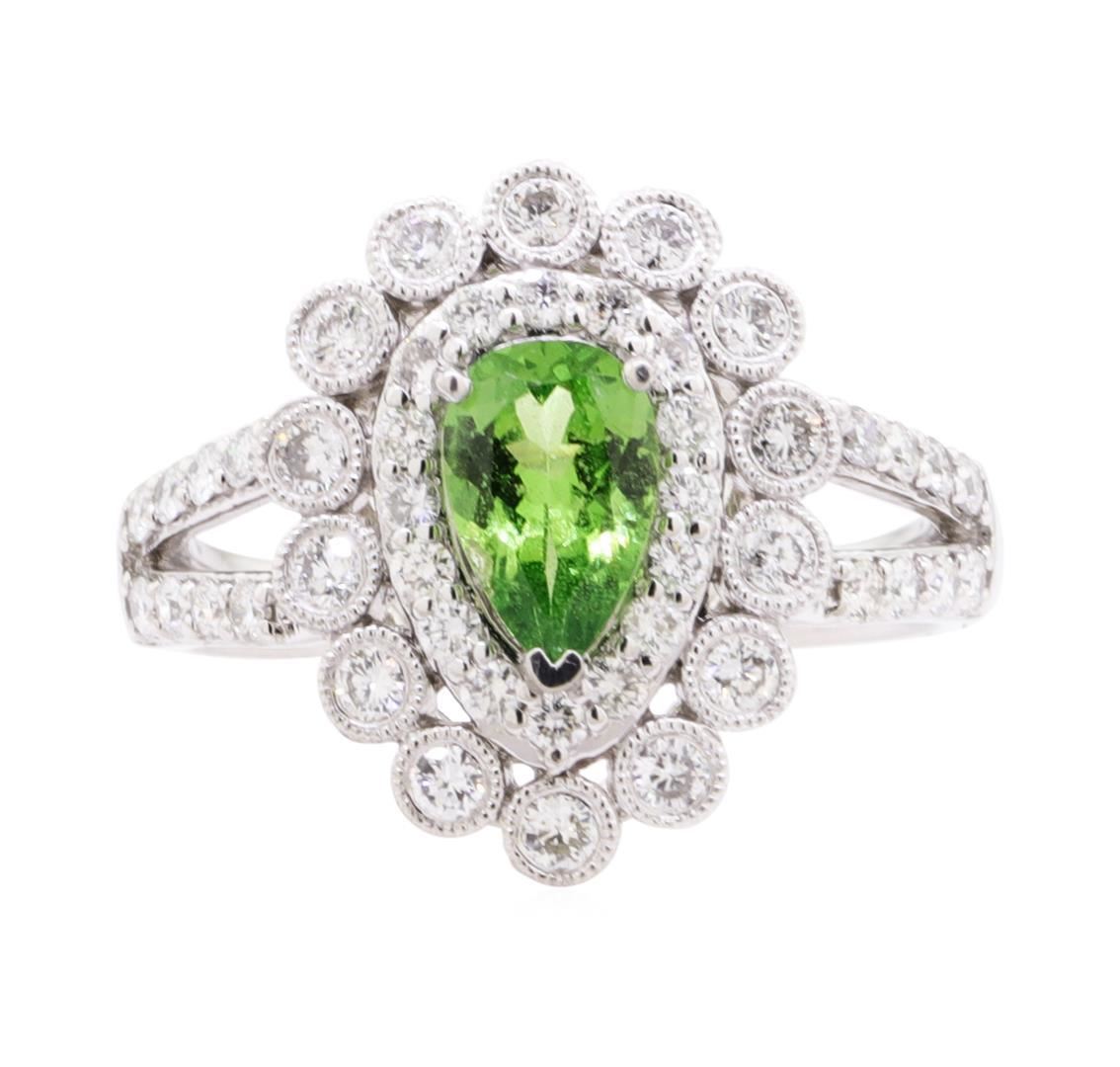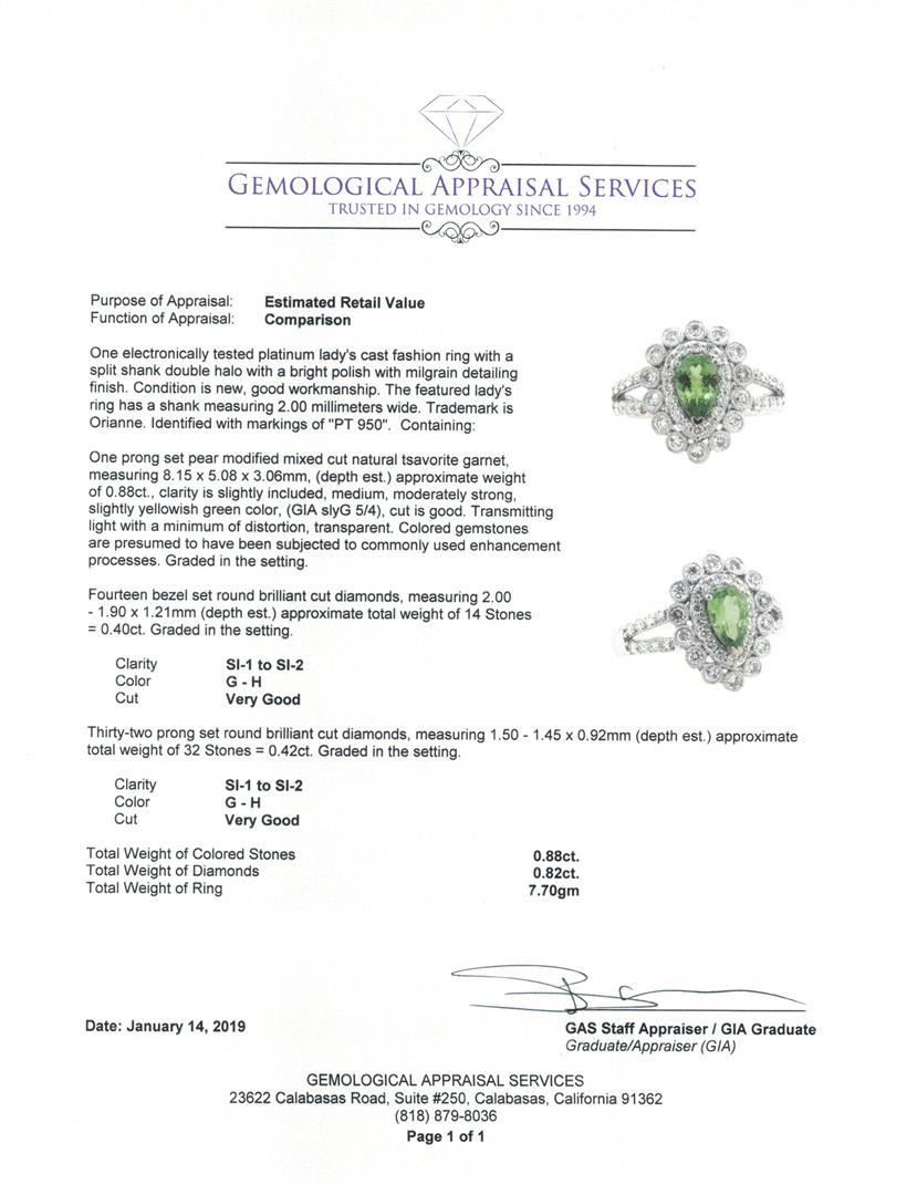 One electronically tested platinum lady's cast fashion ring with a split shank double halo with a bright polish with milgrain detailing finish. The featured lady's ring has a shank measuring 2.00 millimeters wide. Trademark is Orianne. Identified with markings of 'PT 950'. Condition is new, good workmanship. Containing: One prong set pear modified mixed cut natural tsavorite garnet, measuring 8.15 x 5.08 x 3.06mm, (depth est.) approximate weight of 0.88ct., clarity is slightly included, medium, moderately strong, slightly yellowish green color, (GIA slyG 5/4), cut is good. Transmitting light with a minimum of distortion, transparent. Colored gemstones are presumed to have been subjected to commonly used enhancement processes. Graded in the setting. Fourteen bezel set round brilliant cut diamonds, measuring 2.00 - 1.90 x 1.21mm (depth est.) approximate total weight of 14 Stones = 0.40ct. Graded in the setting. Color G - H Clarity SI-1 to SI-2 Cut Very Good Thirty-Two prong set round brilliant cut diamonds, measuring 1.50 - 1.45 x 0.92mm (depth est.) approximate total weight of 32 Stones = 0.42ct. Graded in the setting. Color G - H Clarity SI-1 to SI-2 Cut Very Good. Total Weight of Colored Stones 0.88ct.. Total Weight of Diamonds 0.82ct.. Total Weight of Ring 7.70gm GAS Appraised at $4075.00. GAS Appraised.