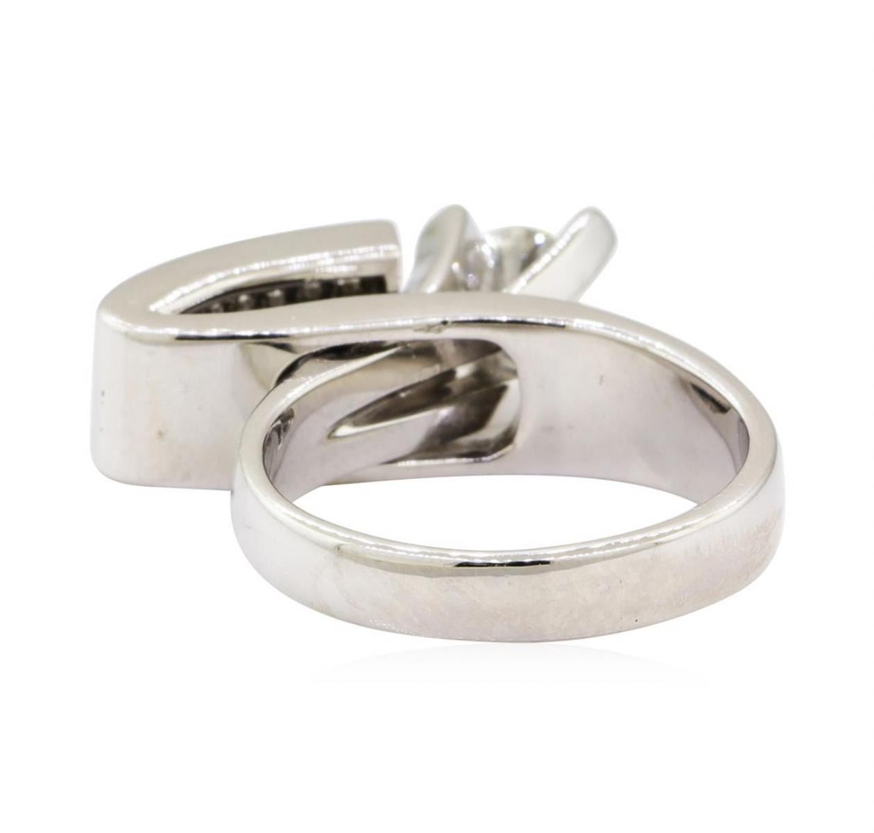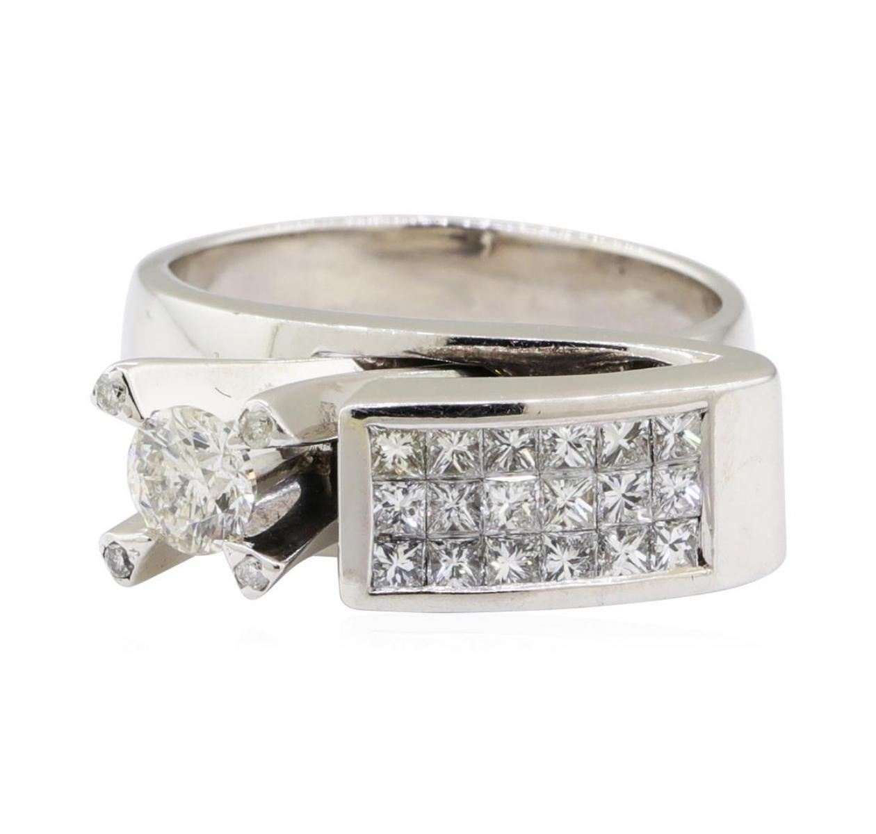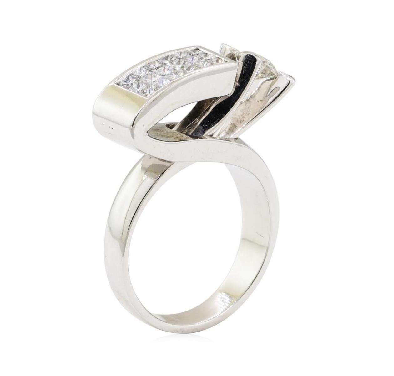 One electronically tested 14KT white gold lady's combination cast & assembled fashion ring with a geometric designer motif with a bright polish finish. The featured lady's ring has a shank measuring 3.70 millimeters wide. Condition is like new, good workmanship. Containing: One prong set round brilliant cut diamond, measuring 4.85 - 4.82 x 3.03mm (depth est.) approximate weight of 0.45ct. Graded in the setting. Color I Clarity SI-2 Cut Very Good Eighteen invisible set princess cut diamonds, measuring 2.00 x 1.90 x 1.43mm (depth est.) approximate total weight of 18 Stones = 0.80ct. Graded in the setting. Color H - I Clarity VS-2 to SI-2 Cut Very Good Four bead set round brilliant cut diamonds, measuring 1.40 - 1.35 x 0.86mm (depth est.) approximate total weight of 4 Stones = 0.04ct. Graded in the setting. Color H - I Clarity SI-2 to I-1 Cut Good. Total Weight of Diamonds 1.29ct.. Total Weight of Ring 11.40gm GAS Appraised at $5275.00. GAS Appraised.