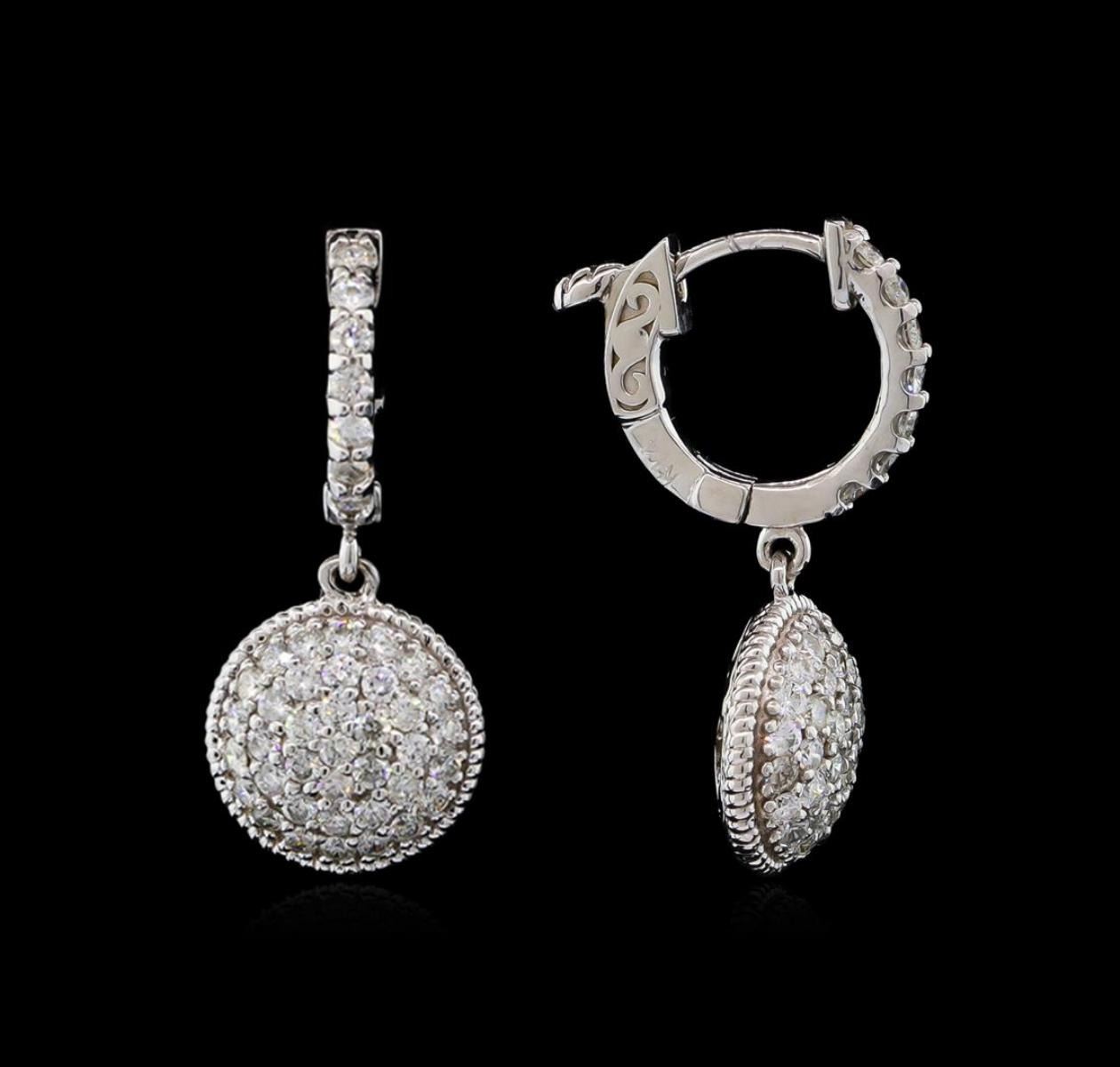 One pair electronically tested 14KT white gold lady's combination cast & assembled fashion dangle earrings with hinged, snap locking posts with a bright polish finish. Identified with markings of "K14". Condition is new, good workmanship. Containing: Eighty-Eight prong set round brilliant cut diamonds, measuring 1.60 - 1.55 x 0.98mm (depth est.) approximate total weight of 88 Stones = 1.30 ct. Graded in the setting. Clarity: SI-1 to SI-2. Color: H - I. Cut Good. Total Weight of Diamonds 1.30 ct. Total Weight of Earrings 5.40gm. GAS Appraised.