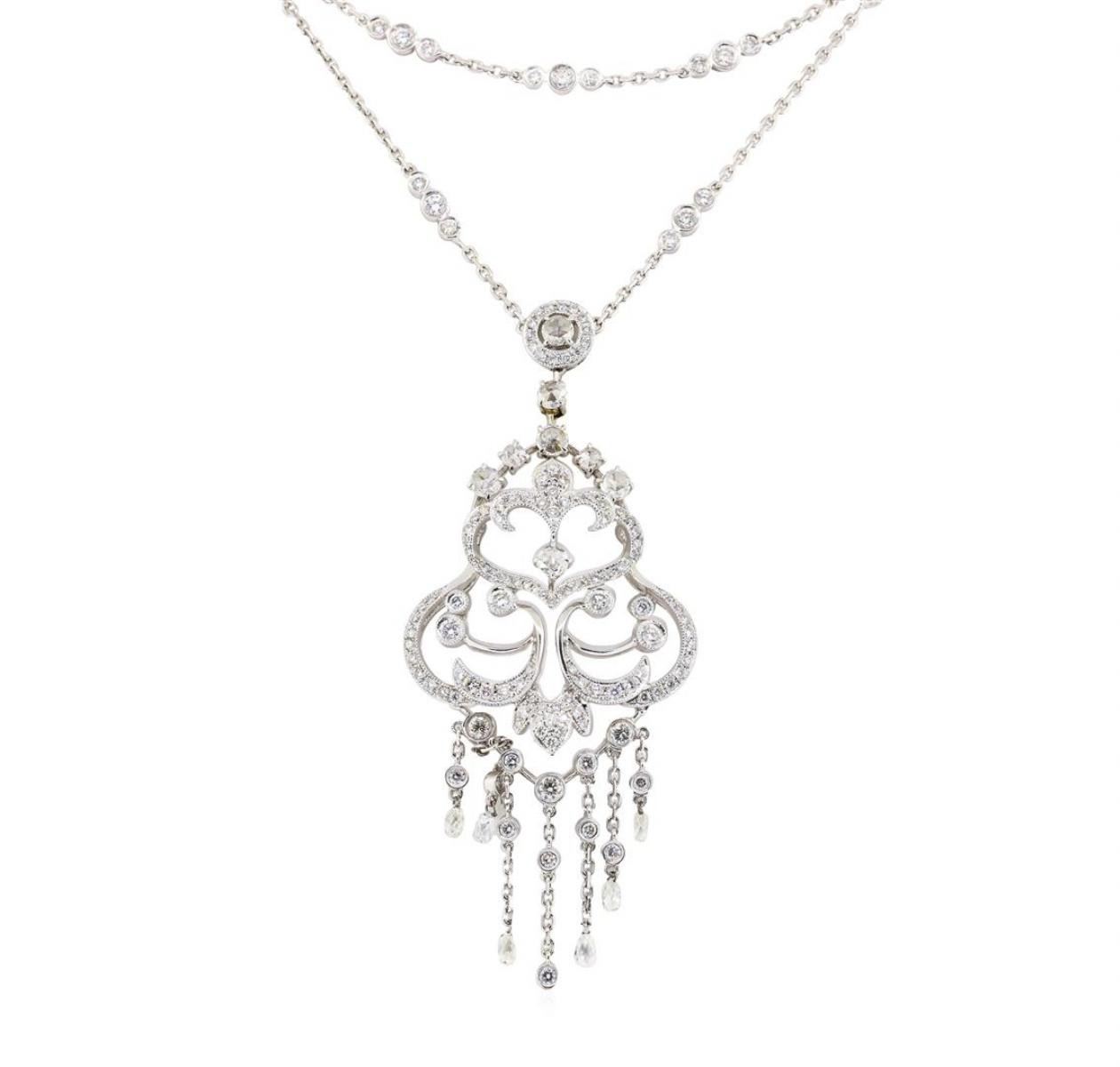 One electronically tested 14KT white gold lady's combination cast & assembled fashion chandelier style necklace with a lobster claw clasp with a bright polish with milgrain detailing finish. The featured lady's necklace has an adjustable clasp that can be worn between eighteen and twenty inches in length. Identified with markings of '14K'. Condition is new, good workmanship. Containing: Eight prong set rose cut diamonds, measuring 3.00 - 2.50 x 1.65mm (depth est.) approximate total weight of 8 Stones = 0.40ct. Graded in the setting. Color H - I Clarity VS-2 to SI-1 Cut Good Six claw set briolette cut diamonds, measuring 3.50 x 2.00 x 0.00mm (depth est.) approximate total weight of 6 Stones = 0.90ct. Graded in the setting. Color H - I Clarity SI-1 to SI-2 Cut Good Fifty-Seven bezel set round brilliant cut diamonds, measuring 2.00 - 1.60 x 1.12mm (depth est.) approximate total weight of 57 Stones = 1.25ct. Graded in the setting. Color H - I Clarity SI-1 to SI-2 Cut Good Ninety-Nine prong set round brilliant cut diamonds, measuring 1.40 - 1.30 x 0.84mm (depth est.) approximate total weight of 99 Stones = 0.95ct. Graded in the setting. Color H - I Clarity VS-2 to SI-2 Cut Good. Total Weight of Diamonds 3.50ct.. Total Weight of Necklace 14.10gm GAS Appraised at $7840.00. GAS Appraised.