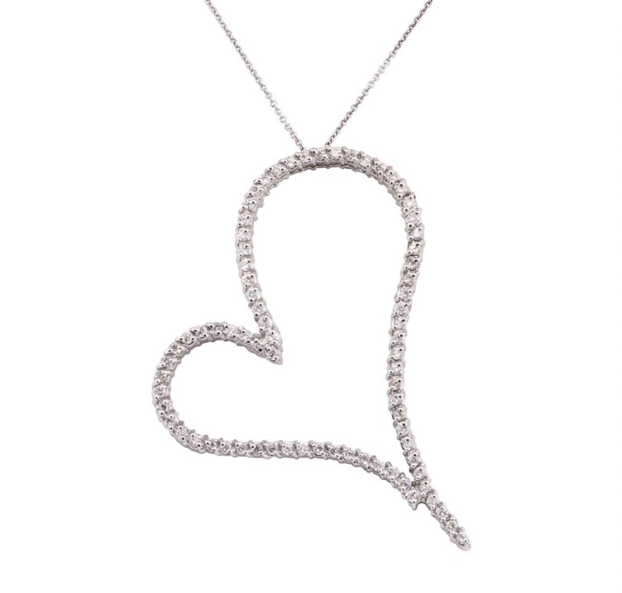 One electronically tested 14KT white gold lady's combination cast & assembled fashion heart shape pendant and chain 16.0' long, 1mm round cable link with a spring ring clasp with a bright polish finish. Identified with markings of '14K'. Condition is like new, good workmanship. Containing: Seventy-Seven prong set round brilliant cut diamonds, measuring 1.70 - 1.60 x 1.02mm (depth est.) approximate total weight of 77 Stones = 1.30ct. Graded in the setting. Color I - J Clarity I-1 to I-2 Cut Good. Total Weight of Diamonds 1.30ct.. Total Weight of Pendant And Chain 11.20gm GAS Appraised at $3830.00. GAS Appraised at $3,830.00.