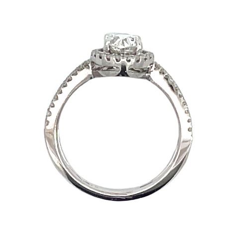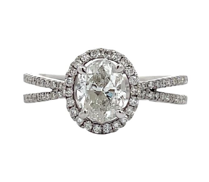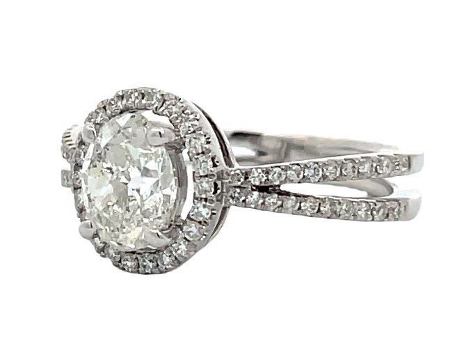 One electronically tested 14KT white gold lady's cast oval halo wedding ring with a reverse split shank with a bright polish finish. The featured lady's ring has a shank measuring 3.00 millimeters wide. Identified with markings of "14K". Condition is new, good workmanship. Containing: One prong set oval shaped cut diamond, measuring 7.28 x 5.63 x 3.55mm (depth est.), 6.00% GTCF approximate weight of 1.00ct. Graded in the setting. Color I Clarity SI-3 Cut Good Sixty-Two prong set round brilliant cut diamonds, measuring 1.10 - 1.05 x 0.67mm (depth est.) approximate total weight of 62 Stones = 0.30ct. Graded in the setting. Color H - I Clarity SI-1 to SI-2 Cut Very Good Total Weight of Diamonds 1.30ct. Total Weight of Wedding Ring 3.40gm