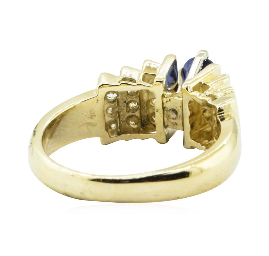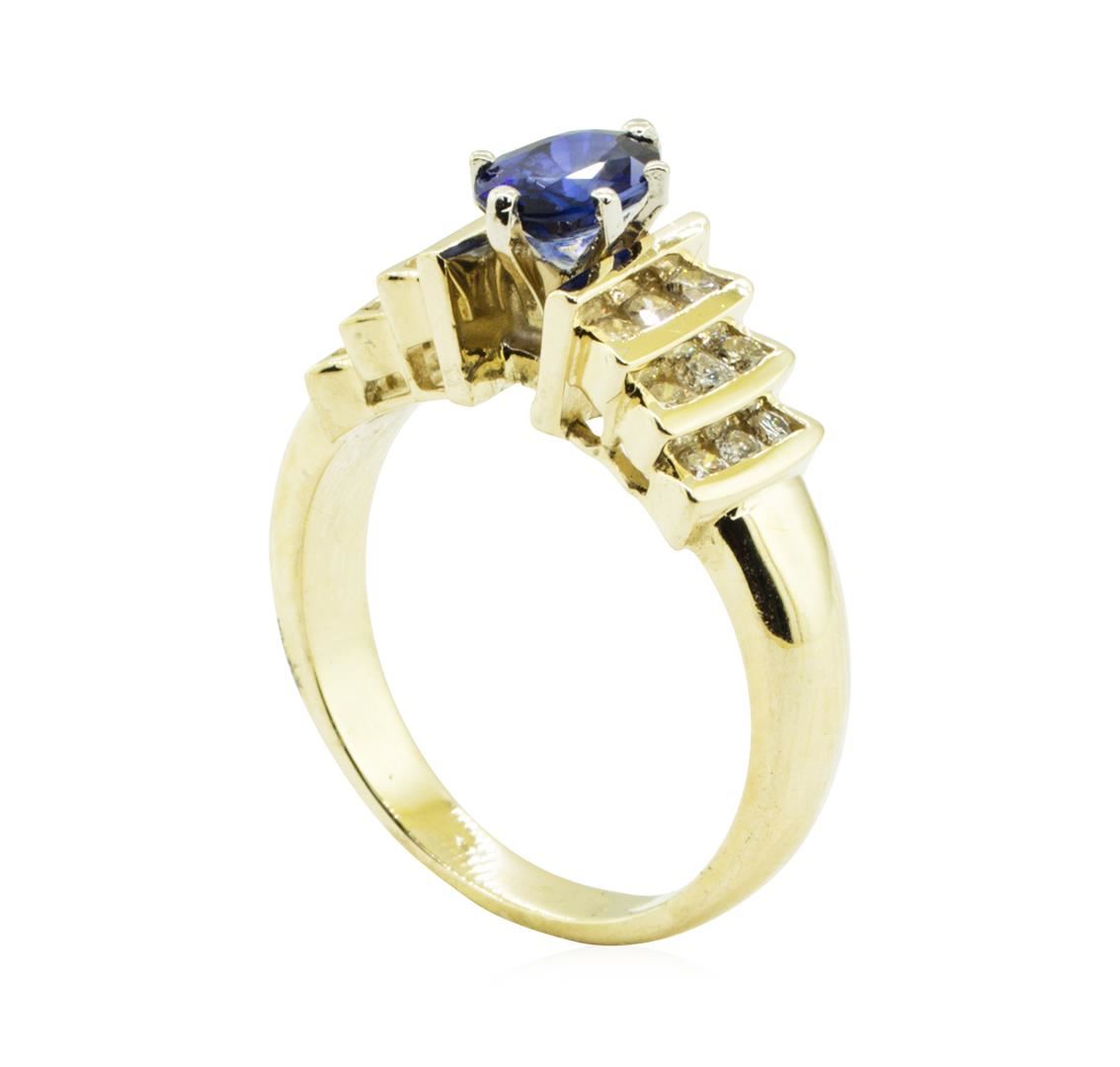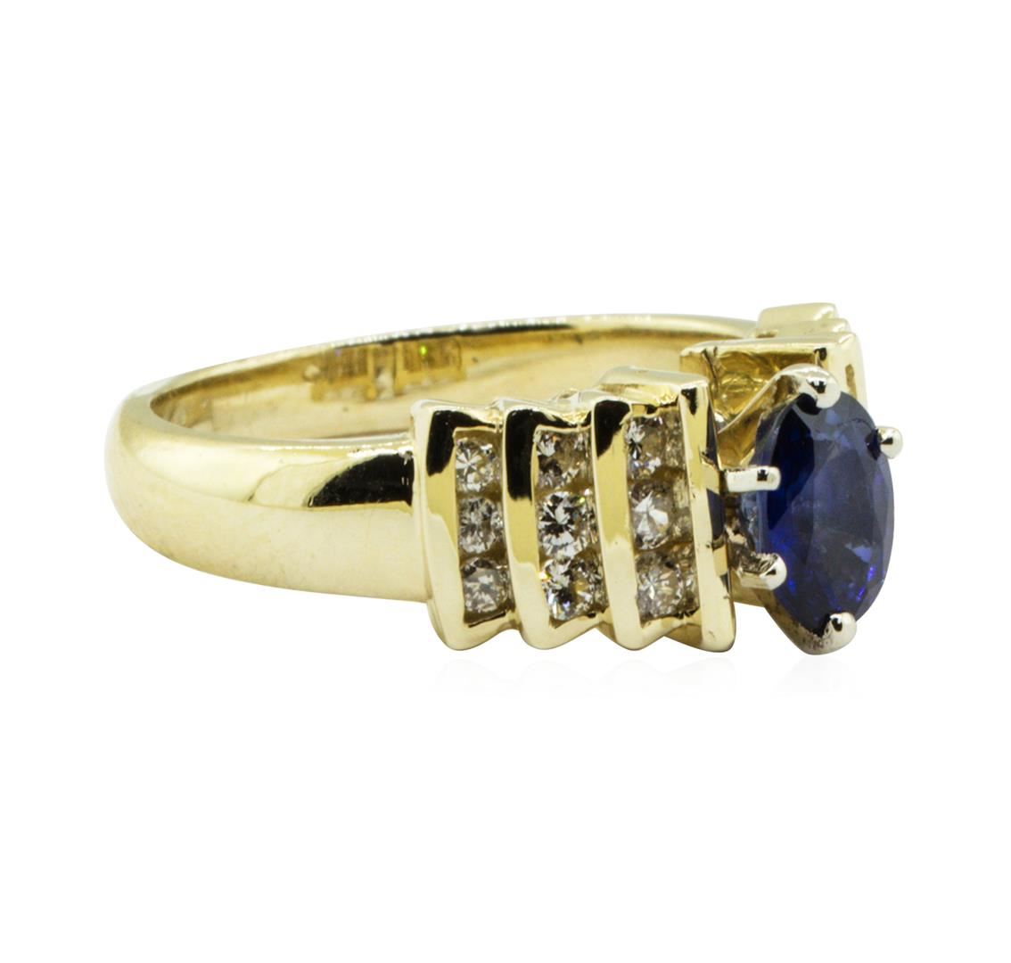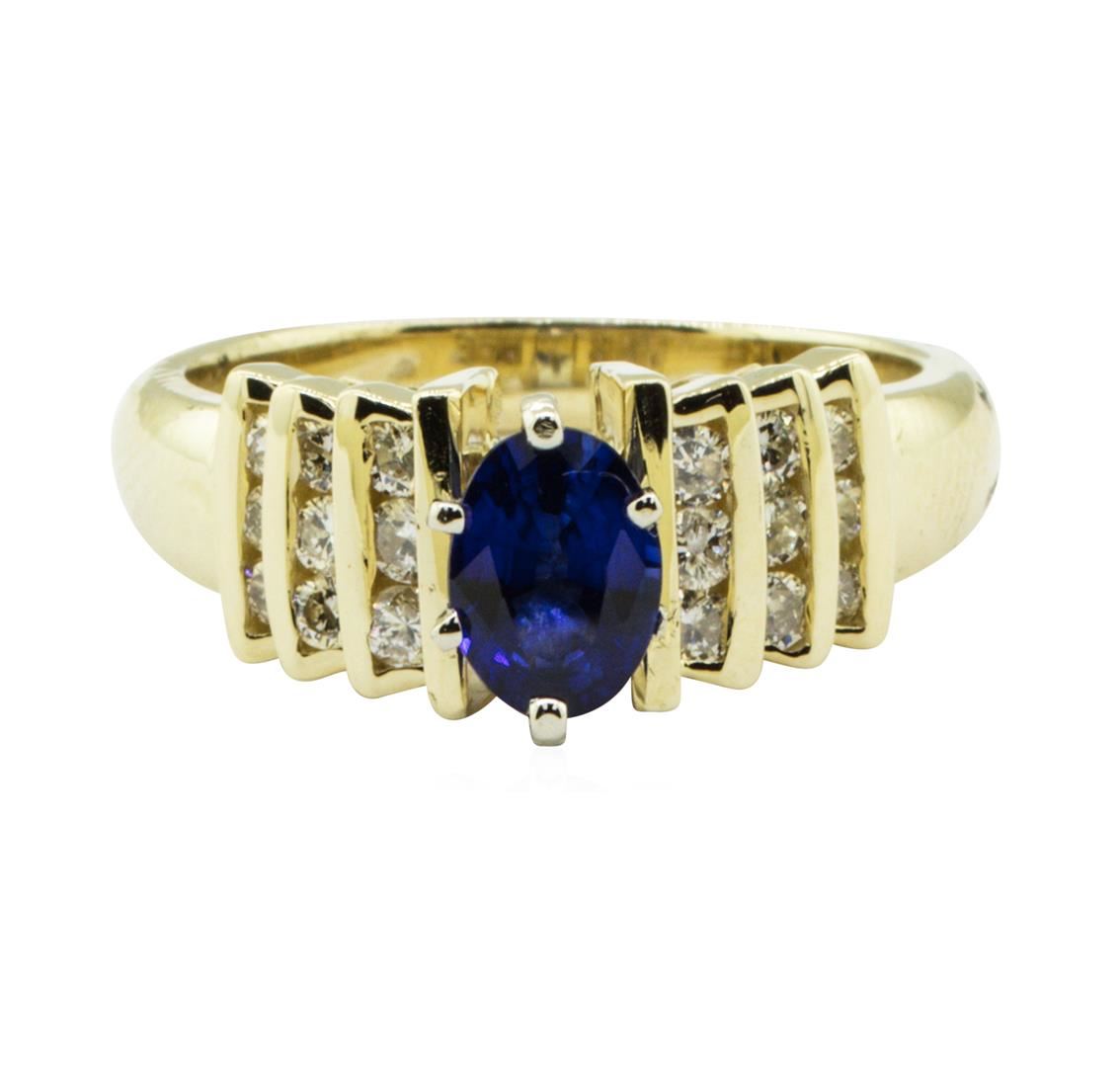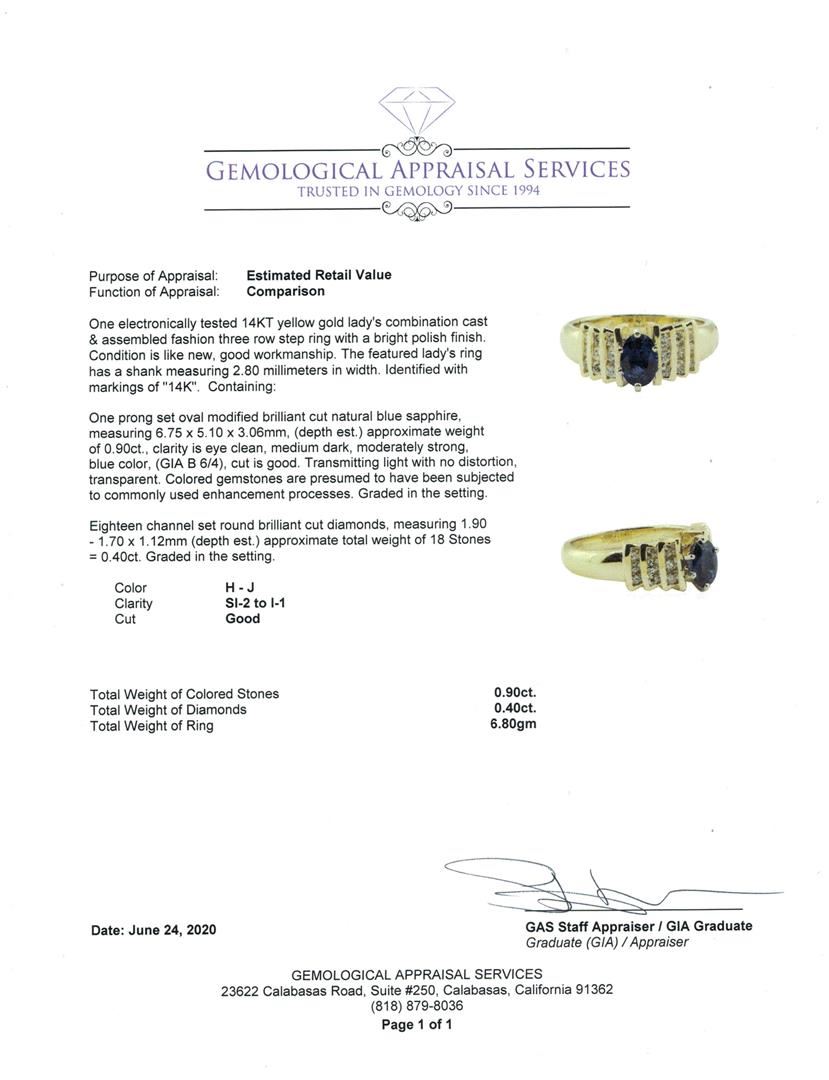 One electronically tested 14KT yellow gold lady's combination cast & assembled fashion three row step ring with a bright polish finish. The featured lady's ring has a shank measuring 2.80 millimeters in width. Identified with markings of '14K'. Condition is like new, good workmanship. Containing: One prong set oval modified brilliant cut natural blue sapphire, measuring 6.75 x 5.10 x 3.06mm, (depth est.) approximate weight of 0.90ct., clarity is eye clean, medium dark, moderately strong, blue color, (GIA B 6/4), cut is good. Transmitting light with no distortion, transparent. Colored gemstones are presumed to have been subjected to commonly used enhancement processes. Graded in the setting. Eighteen channel set round brilliant cut diamonds, measuring 1.90 - 1.70 x 1.12mm (depth est.) approximate total weight of 18 Stones = 0.40ct. Graded in the setting. Color H - J Clarity SI-2 to I-1 Cut Good. Total Weight of Colored Stones 0.90ct.. Total Weight of Diamonds 0.40ct.. Total Weight of Ring 6.80gm GAS Appraised at $3390.00. GAS Appraised.
