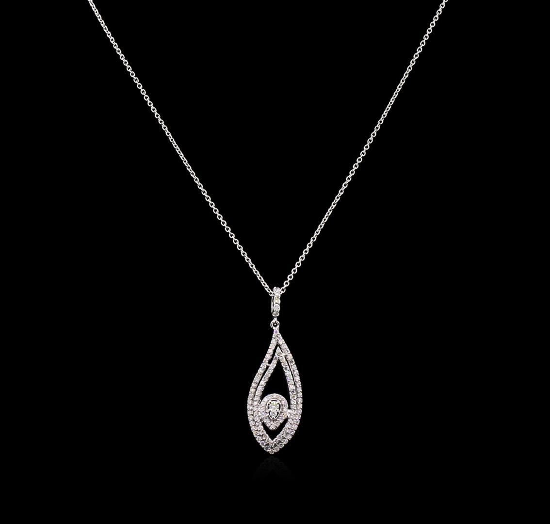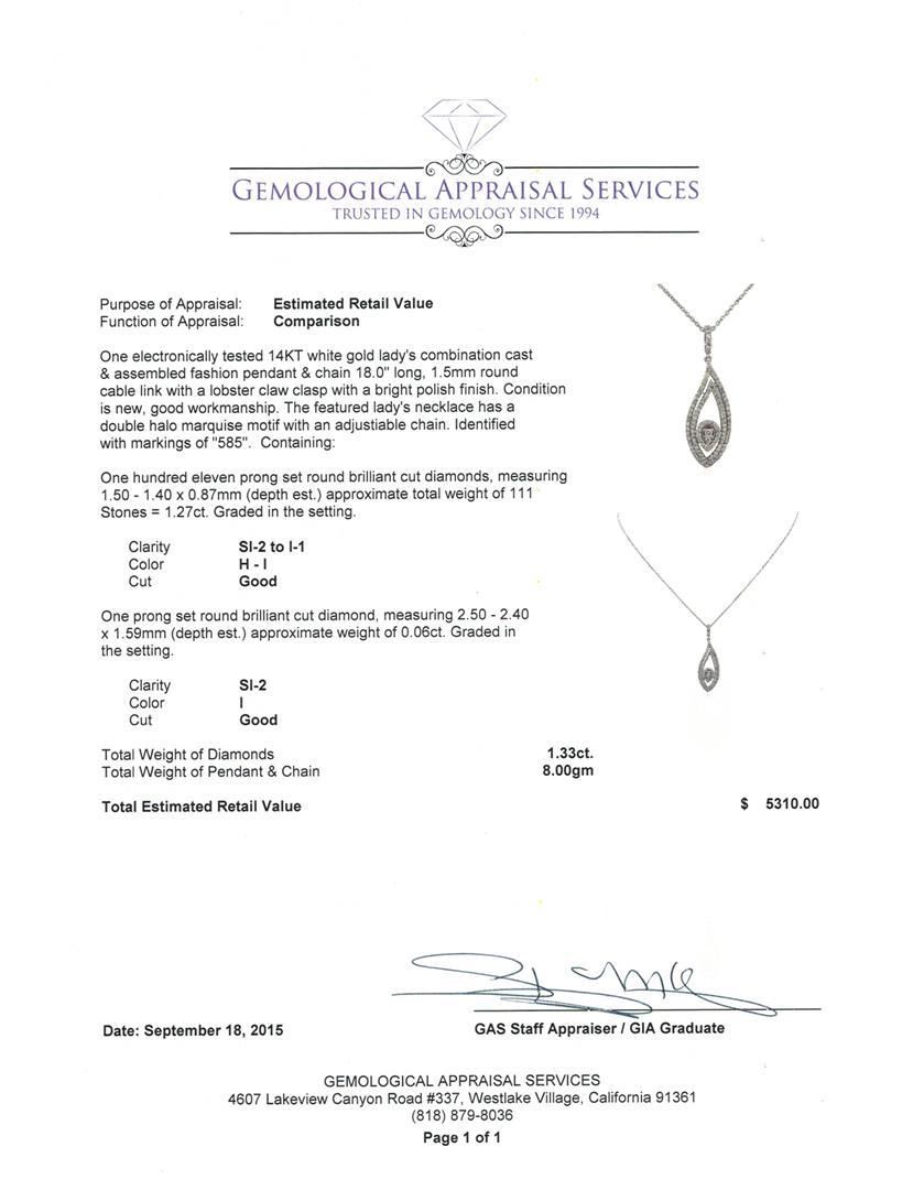 One electronically tested 14KT white gold lady's combination cast & assembled fashion pendant & chain 18.0" long, 1.5mm round cable link with a lobster claw clasp with a bright polish finish. The featured lady's necklace has a double halo marquise motif with an adjustable chain. Identified with markings of "585". Condition is new, good workmanship. Containing: One Hundred Eleven prong set round brilliant cut diamonds, measuring 1.50 - 1.40 x 0.87mm (depth est.) approximate total weight of 111 Stones = 1.27ct. Graded in the setting. Clarity: SI-2 to I-1. Color: H - I. Cut Good One prong set round brilliant cut diamond, measuring 2.50 - 2.40 x 1.59mm (depth est.) approximate weight of 0.06ct. Graded in the setting. Clarity: SI-2. Color: I. Cut Good. Total Weight of Diamonds 1.33ct. Total Weight of Pendant & Chain 8.00gm. GAS Appraised.