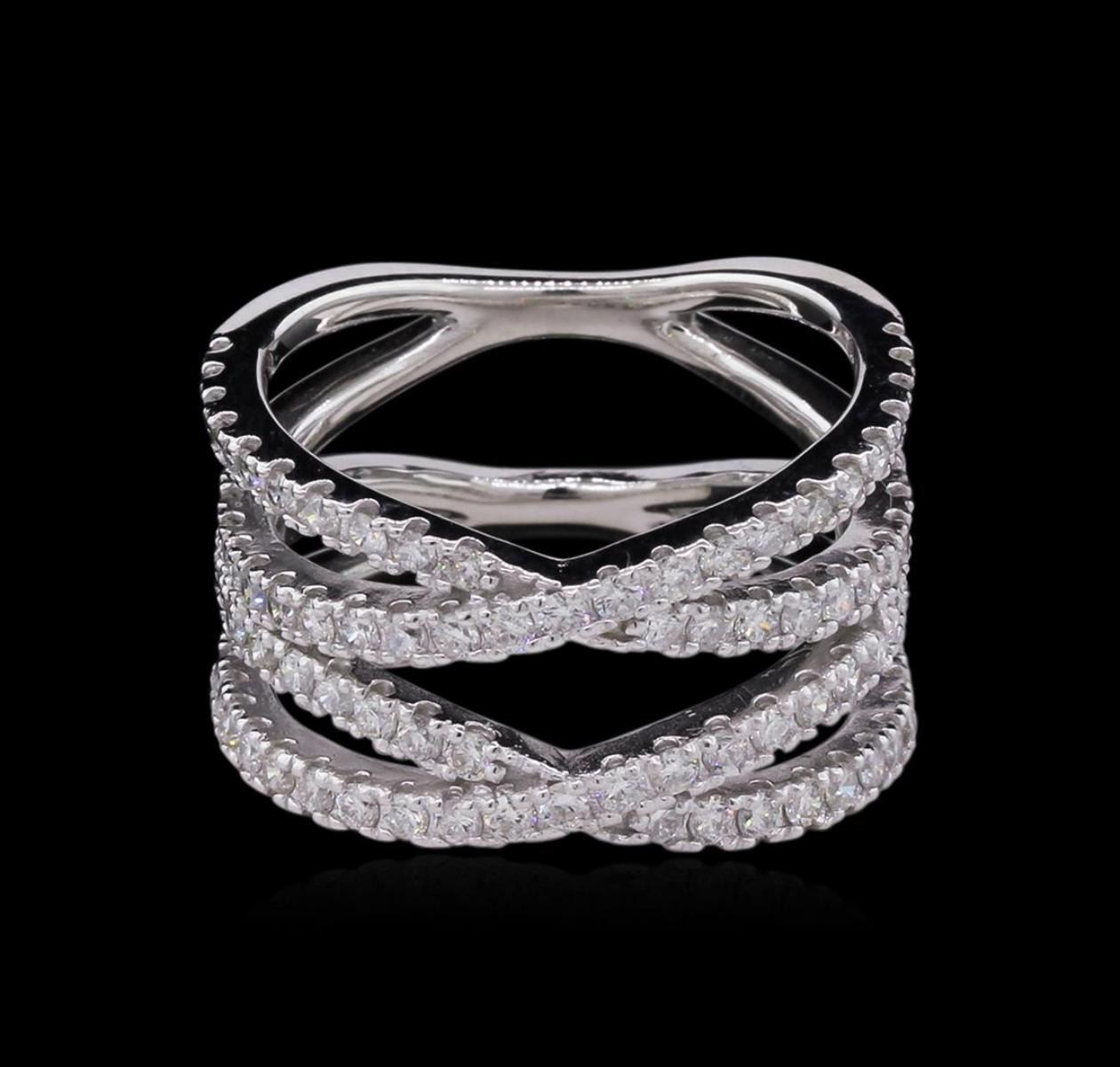 One electronically tested 14KT white gold lady's cast fashion ring with a crossover split shank with a bright polish finish. The featured lady's ring has a double shank measuring 9.00 millimeters in width. Identified with markings of "14K". Condition is new, good workmanship. Containing: Eighty-Six prong set round brilliant cut diamonds, measuring 1.60 - 1.55 x 1.03mm (depth est.) approximate total weight of 86 Stones = 1.33ct. Graded in the setting. Clarity: SI-1 to SI-2 . Color: G - I. Cut Good. Total Weight of Diamonds 1.33ct.. Total Weight of Ring 7.10gm at $ 4865.00 GAS Appraised.