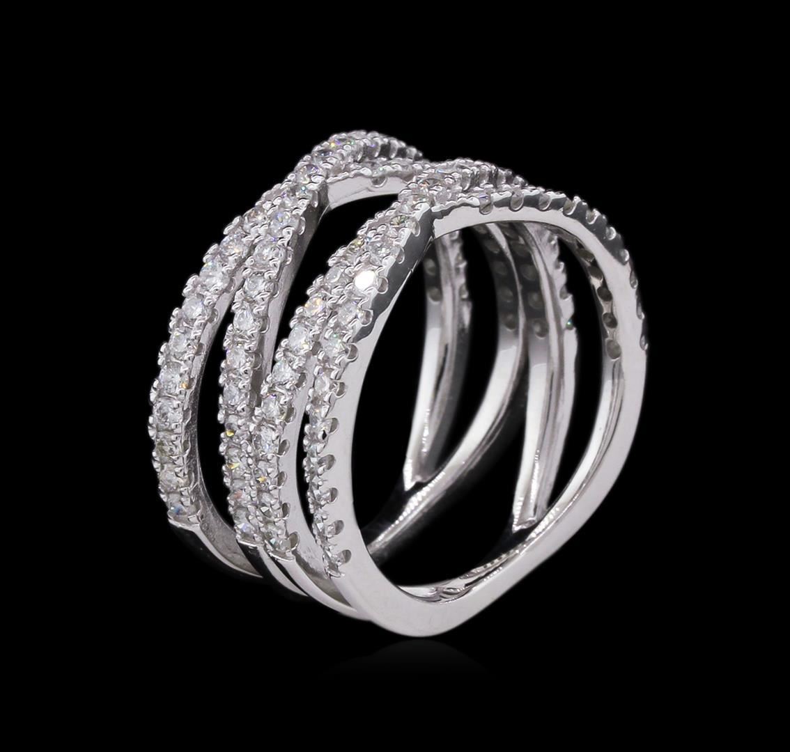 One electronically tested 14KT white gold lady's cast fashion ring with a crossover split shank with a bright polish finish. The featured lady's ring has a double shank measuring 9.00 millimeters in width. Identified with markings of "14K". Condition is new, good workmanship. Containing: Eighty-Six prong set round brilliant cut diamonds, measuring 1.60 - 1.55 x 1.03mm (depth est.) approximate total weight of 86 Stones = 1.33ct. Graded in the setting. Clarity: SI-1 to SI-2 . Color: G - I. Cut Good. Total Weight of Diamonds 1.33ct.. Total Weight of Ring 7.10gm at $ 4865.00 GAS Appraised.