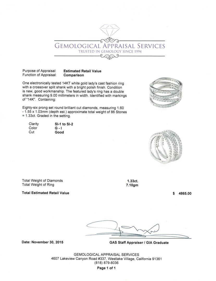 One electronically tested 14KT white gold lady's cast fashion ring with a crossover split shank with a bright polish finish. The featured lady's ring has a double shank measuring 9.00 millimeters in width. Identified with markings of "14K". Condition is new, good workmanship. Containing: Eighty-Six prong set round brilliant cut diamonds, measuring 1.60 - 1.55 x 1.03mm (depth est.) approximate total weight of 86 Stones = 1.33ct. Graded in the setting. Clarity: SI-1 to SI-2 . Color: G - I. Cut Good. Total Weight of Diamonds 1.33ct.. Total Weight of Ring 7.10gm at $ 4865.00 GAS Appraised.