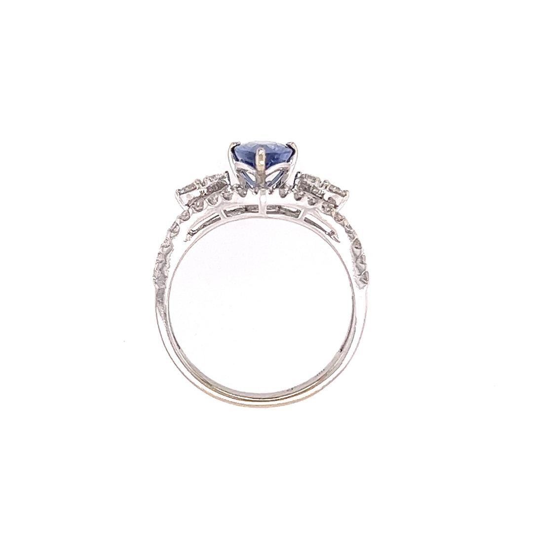 One electronically tested 18KT white gold lady's combination cast & assembled custom fashion ring with a chevron motif with a bright polish finish. Condition is new, good workmanship. The featured lady's ring has a shank measuring 2.40 millimeters in width. Identified with markings of "18K". Containing: One prong set pear modified brilliant cut natural blue sapphire, measuring 9.65 x 5.55 x 3.20mm, (depth est.) approximate weight of 1.33ct., clarity is eye clean, medium light, very slightly grayish, blue color, (GIA B 4/3), cut is very good. Transmitting light with no distortion, transparent. Colored gemstones are presumed to have been subjected to commonly used enhancement processes. Graded in the setting. Two prong set round brilliant cut diamonds, measuring 2.55 - 2.50 x 1.57mm (depth est.) approximate total weight of 2 Stones = 0.12ct. Clarity of SI-1 to SI-2, color of G - H, cut is very good. Graded in the setting. Two prong set round brilliant cut diamonds, measuring 2.30 - 2.25 x 1.41mm (depth est.) approximate total weight of 2 Stones = 0.09ct. Clarity of VS-2 to SI-1, color of G - H, cut is very good. Graded in the setting. Appraisal No: 000022197000 Thirty-eight prong set round brilliant cut diamonds, measuring 1.60 - 1.50 x 0.96mm (depth est.) approximate total weight of 38 Stones = 0.54ct. Clarity of VS-2 to SI-1, color of G - H, cut is very good. Graded in the setting. Total Weight of Colored Stones Total Weight of Diamonds Total Weight of Ring 1.33ct. 0.75ct. 3.80gm Total Estimated Retail Value $ 5290.00