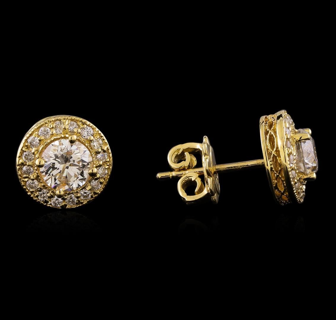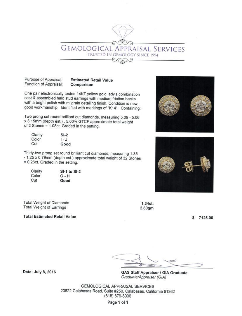 One pair electronically tested 14KT yellow gold lady's combination cast & assembled halo stud earrings with medium friction backs with a bright polish with milgrain detailing finish. Identified with markings of "K14". Condition is new, good workmanship. Containing: Two prong set round brilliant cut diamonds, measuring 5.09 - 5.06 x 3.15mm (depth est.) , 5.00.%. GTCF approximate total weight of 2 Stones = 1.08ct. Graded in the setting. Clarity: SI-2. Color: I - Good Thirty-Two prong set round brilliant cut diamonds, measuring 1.35 - 1.25 x 0.79mm (depth est.) approximate total weight of 32 Stones = 0.26ct. Graded in the setting. Clarity: SI-1 to SI-2. Color: G - Good. Total Weight of Diamonds 1.34ct. Total Weight of Earrings 2.80gm. GAS Appraised.