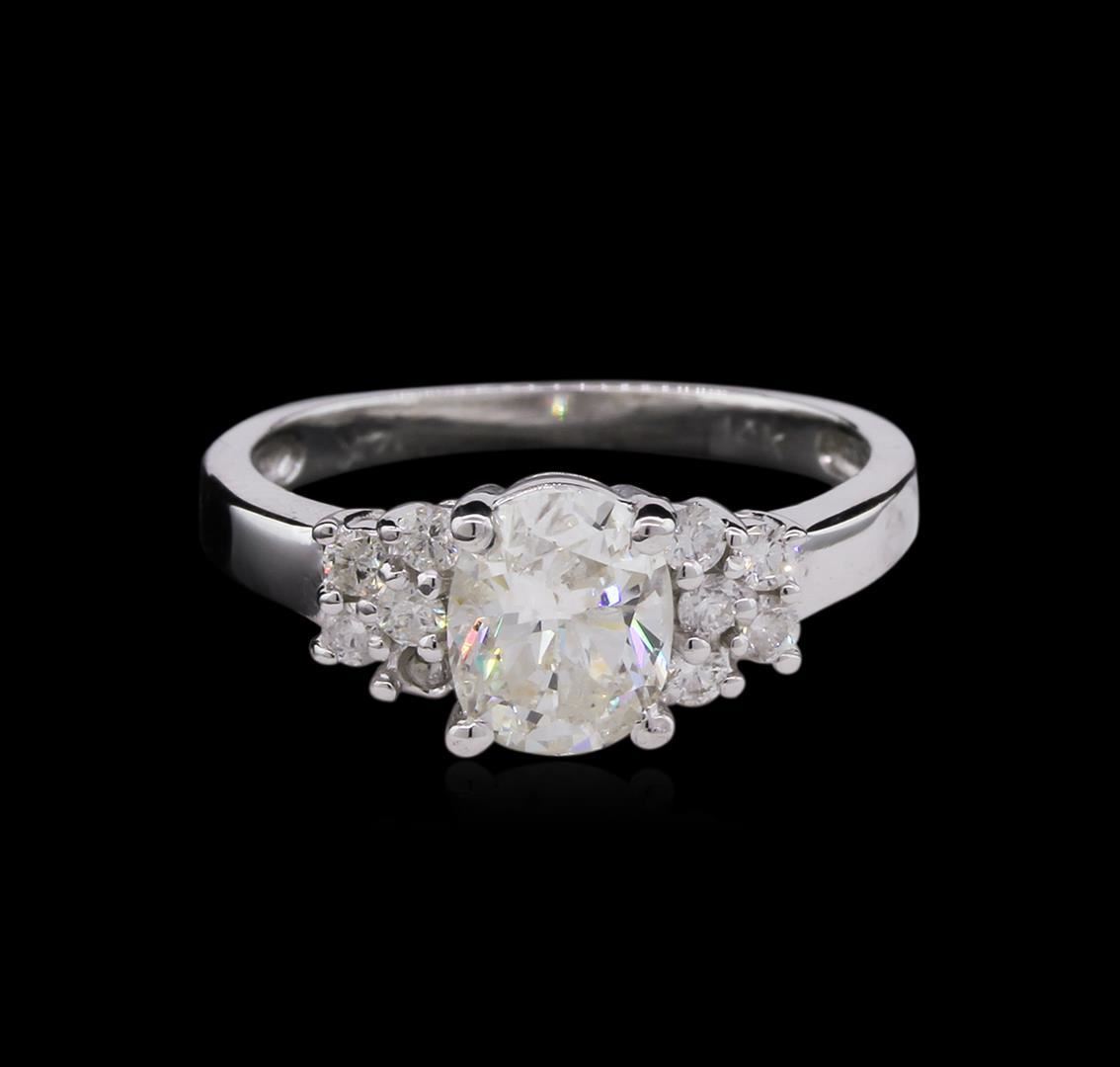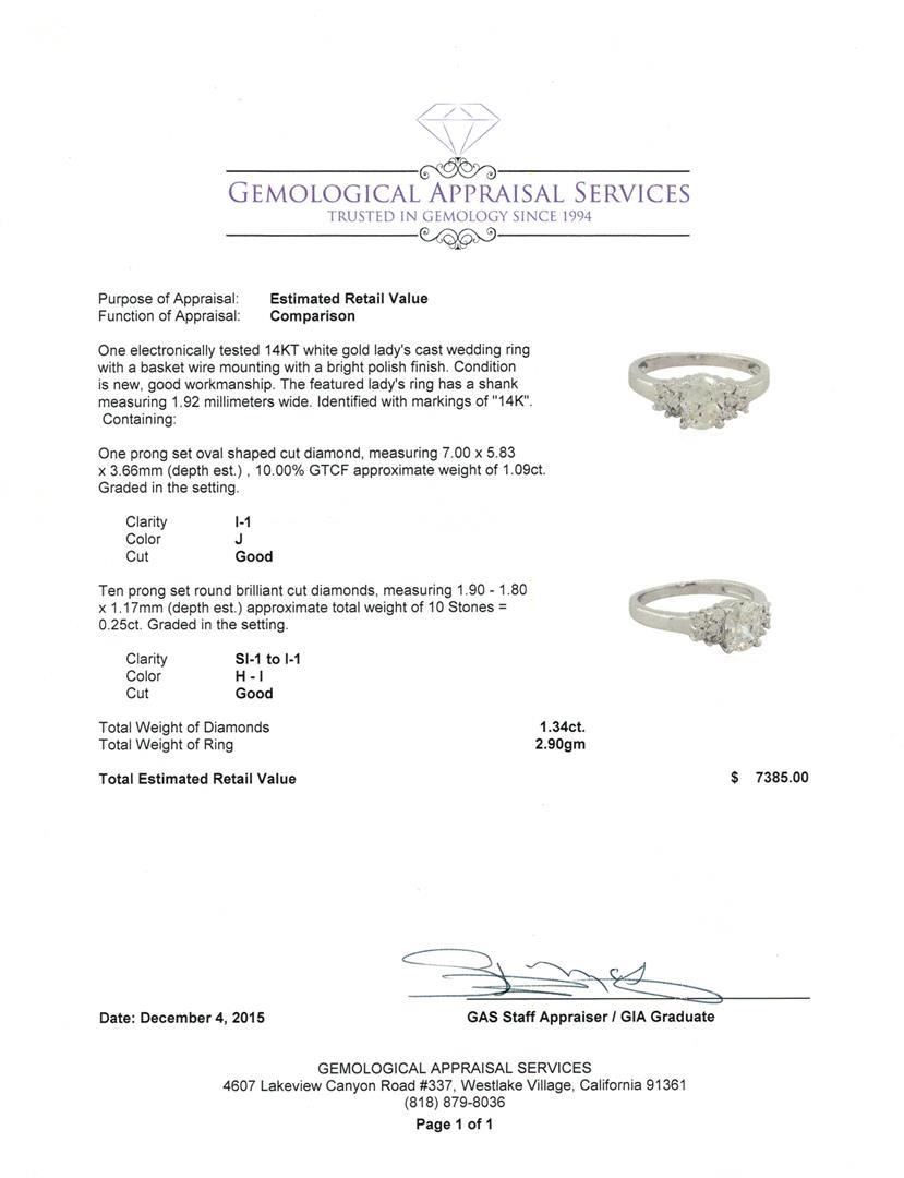One electronically tested 14KT white gold lady's cast wedding ring with a basket wire mounting with a bright polish finish. The featured lady's ring has a shank measuring 1.92 millimeters wide. Identified with markings of "14K". Condition is new, good workmanship. Containing: One prong set oval shaped cut diamond, measuring 7.00 x 5.83 x 3.66mm (depth est.) , 10.00.%. GTCF approximate weight of 1.09ct. Graded in the setting. Clarity: I-1. Color: Good Ten prong set round brilliant cut diamonds, measuring 1.90 - 1.80 x 1.17mm (depth est.) approximate total weight of 10 Stones = 0.25ct. Graded in the setting. Clarity: SI-1 to I-1. Color: H - I. Cut Good. Total Weight of Diamonds 1.34ct. Total Weight of Ring 2.90gm. GAS Appraised at $7,385.00. GAS Appraised.