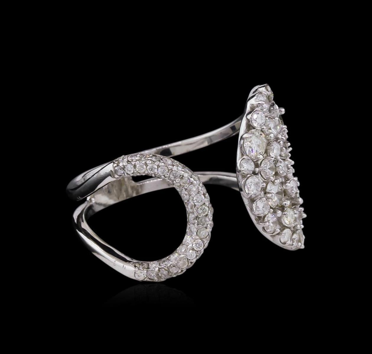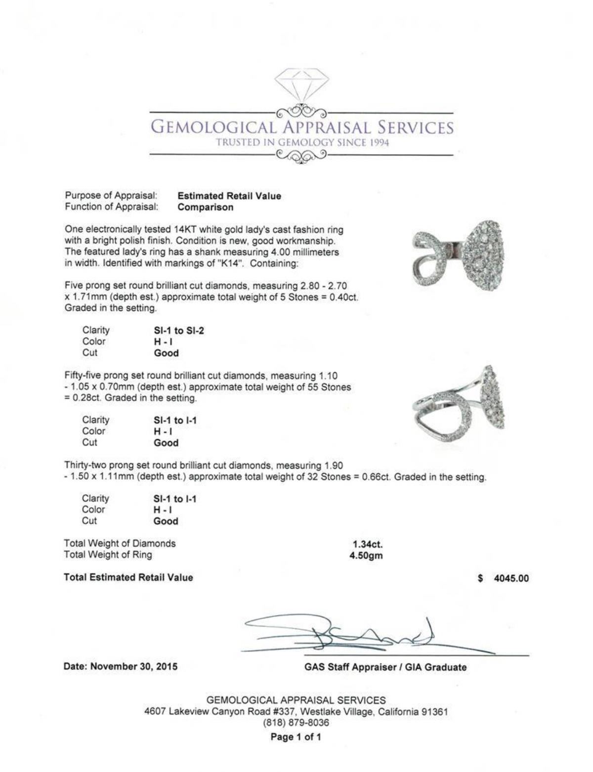 One electronically tested 14KT white gold lady's cast fashion ring with a bright polish finish. The featured lady's ring has a shank measuring 4.00 millimeters in width. Identified with markings of "K14". Condition is new, good workmanship. Containing: Five prong set round brilliant cut diamonds, measuring 2.80 - 2.70 x 1.71mm (depth est.) approximate total weight of 5 Stones = 0.40ct. Graded in the setting. Clarity: SI-1 to SI-2 . Color: H - I. Cut Good Fifty-Five prong set round brilliant cut diamonds, measuring 1.10 - 1.05 x 0.70mm (depth est.) approximate total weight of 55 Stones = 0.28ct. Graded in the setting. Clarity: SI-1 to I-1 . Color: H - I. Cut Good Thirty-Two prong set round brilliant cut diamonds, measuring 1.90 - 1.50 x 1.11mm (depth est.) approximate total weight of 32 Stones = 0.66ct. Graded in the setting. Clarity: SI-1 to I-1 . Color: H - I. Cut Good. Total Weight of Diamonds 1.34ct.. Total Weight of Ring 4.50gm at $ 4045.00 GAS Appraised.