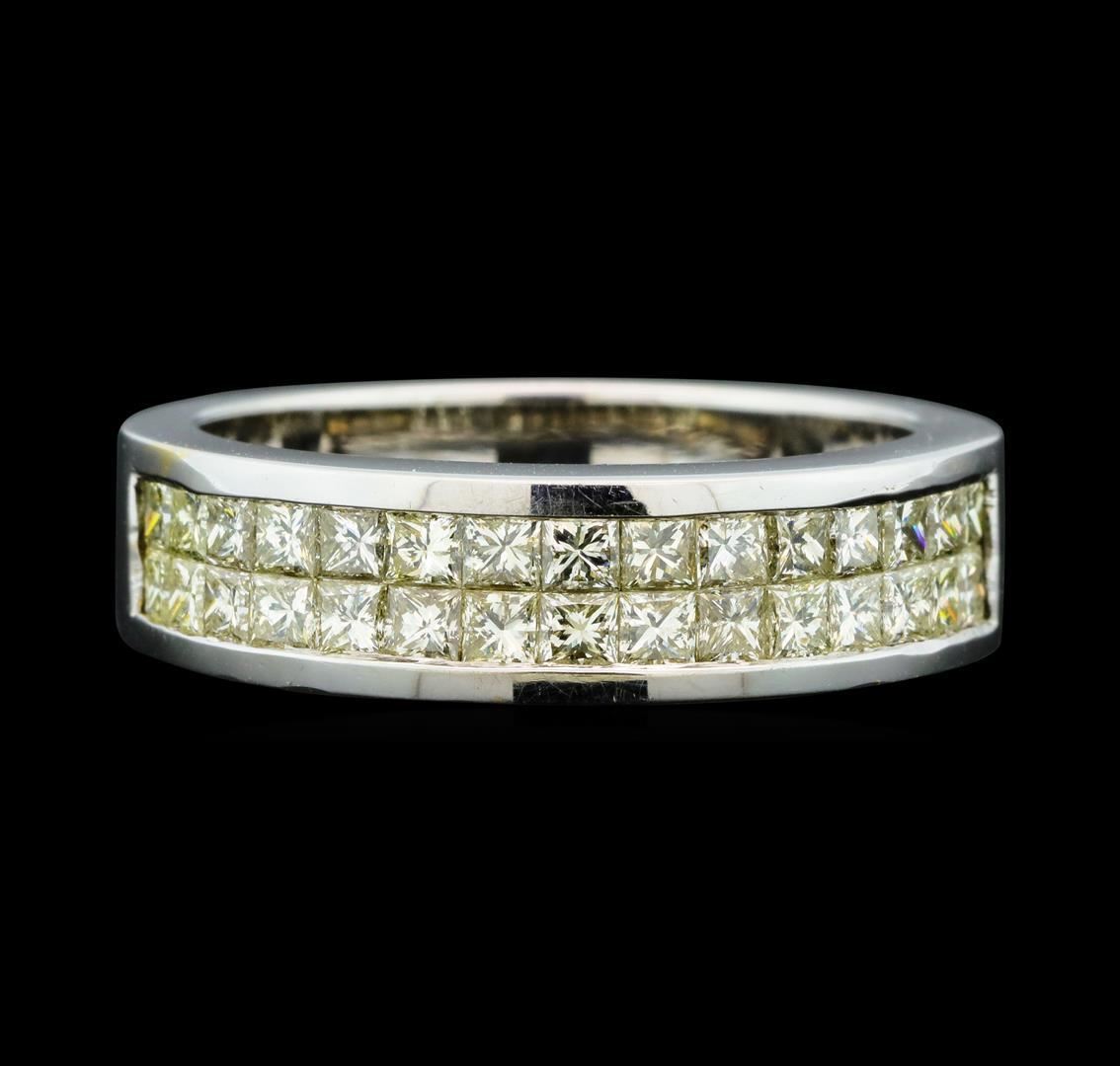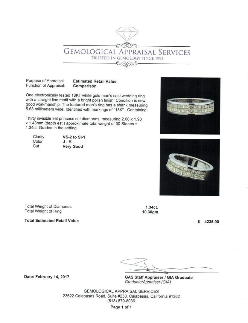 One electronically tested 18KT white gold man's cast wedding ring with a straight line motif with a bright polish finish. The featured man's ring has a shank measuring 5.68 millimeters wide. Identified with markings of '18K'. Condition is new, good workmanship. Containing: Thirty invisible set princess cut diamonds, measuring 2.00 x 1.90 x 1.43mm (depth est.) approximate total weight of 30 Stones = 1.34ct. Graded in the setting. Clarity VS-2 to SI-1. Color: J - K Cut Very Good. Total Weight of Diamonds 1.34ct.. Total Weight of Ring 10.30gm. GAS Appraised.