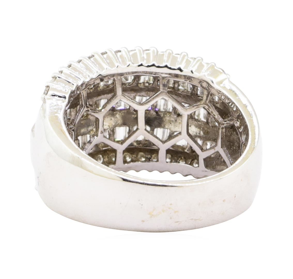 One electronically tested 18KT white gold lady's combination cast & assembled fashion ring with a five row wide band with a bright polish finish. The featured lady's ring has a shank measuring 5.30 millimeters wide. Identified with markings of '18K'. Condition is new, good workmanship. Containing: Sixty-Four channel set baguette cut diamonds, measuring from 1.60 x 1.05 x 0.89mm (depth est.) to 1.70 x 1.10 x 0.94mm (depth est.) approximate total weight of 64 Stones = 0.98ct. Graded in the setting. Color H - I Clarity VS-1 to VS-2 Cut Very Good Thirty prong set round brilliant cut diamonds, measuring 1.50 - 1.45 x 0.92mm (depth est.) approximate total weight of 30 Stones = 0.36ct. Graded in the setting. Color H - I Clarity SI-1 to SI-2 Cut Good. Total Weight of Diamonds 1.34ct.. Total Weight of Ring 10.10gm GAS Appraised at $4985.00. GAS Appraised.