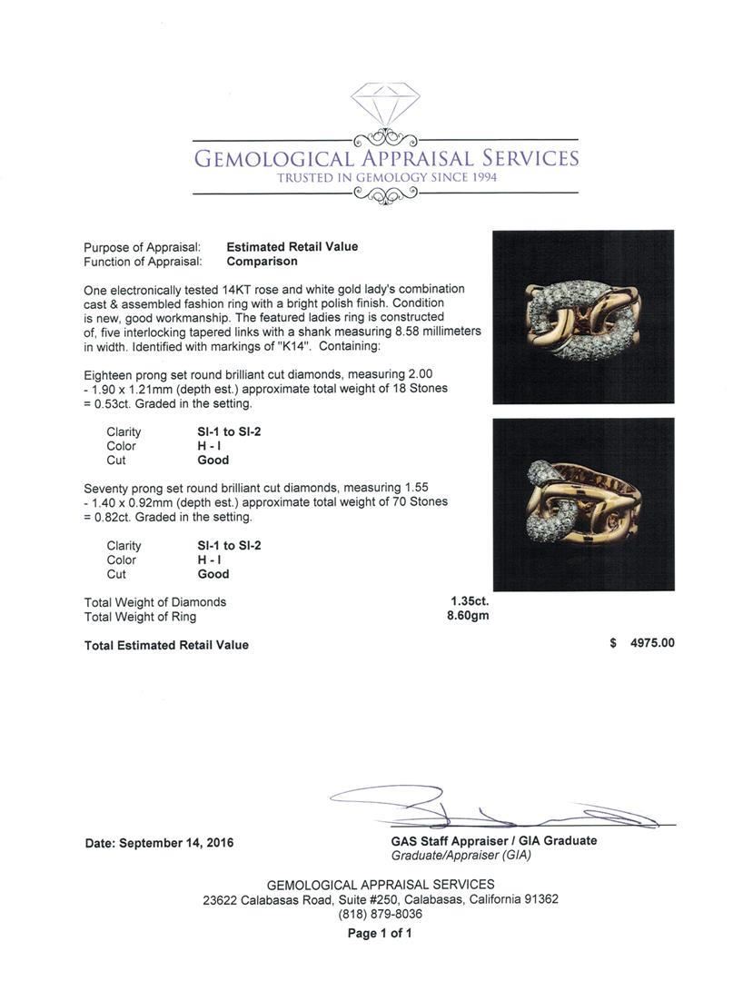 One electronically tested 14KT rose and white gold lady's combination cast & assembled fashion ring with a bright polish finish. The featured ladies ring is constructed of, five interlocking tapered links with a shank measuring 8.58 millimeters in width. Identified with markings of 'K14'. Condition is new, good workmanship. Containing: Eighteen prong set round brilliant cut diamonds, measuring 2.00 - 1.90 x 1.21mm (depth est.) approximate total weight of 18 Stones = 0.53ct. Graded in the setting. Clarity SI-1 to SI-2. Color: H - I Cut Good Seventy prong set round brilliant cut diamonds, measuring 1.55 - 1.40 x 0.92mm (depth est.) approximate total weight of 70 Stones = 0.82ct. Graded in the setting. Clarity SI-1 to SI-2. Color: H - I Cut Good. Total Weight of Diamonds 1.35ct.. Total Weight of Ring 8.60gm GAS Appraised.