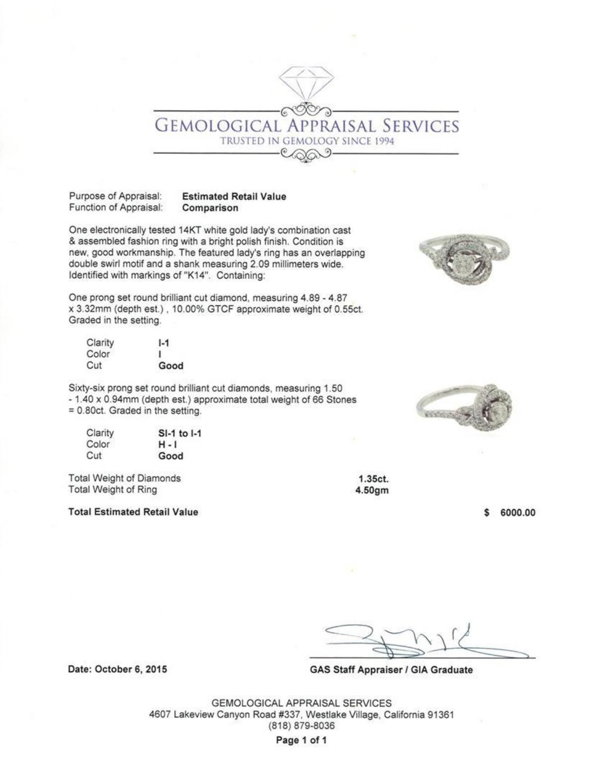 One electronically tested 14KT white gold lady's combination cast & assembled fashion ring with a bright polish finish. The featured lady's ring has an overlapping double swirl motif and a shank measuring 2.09 millimeters wide. Identified with markings of "K14". Condition is new, good workmanship. Containing: One prong set round brilliant cut diamond, measuring 4.89 - 4.87 x 3.32mm (depth est.) , 10.00.%. GTCF approximate weight of 0.55ct. Graded in the setting. Clarity: I-1. Color: I. Cut Good Sixty-Six prong set round brilliant cut diamonds, measuring 1.50 - 1.40 x 0.94mm (depth est.) approximate total weight of 66 Stones = 0.80ct. Graded in the setting. Clarity: SI-1 to I-1. Color: H - I. Cut Good. Total Weight of Diamonds 1.35ct. Total Weight of Ring 4.50gm. GAS Appraised.