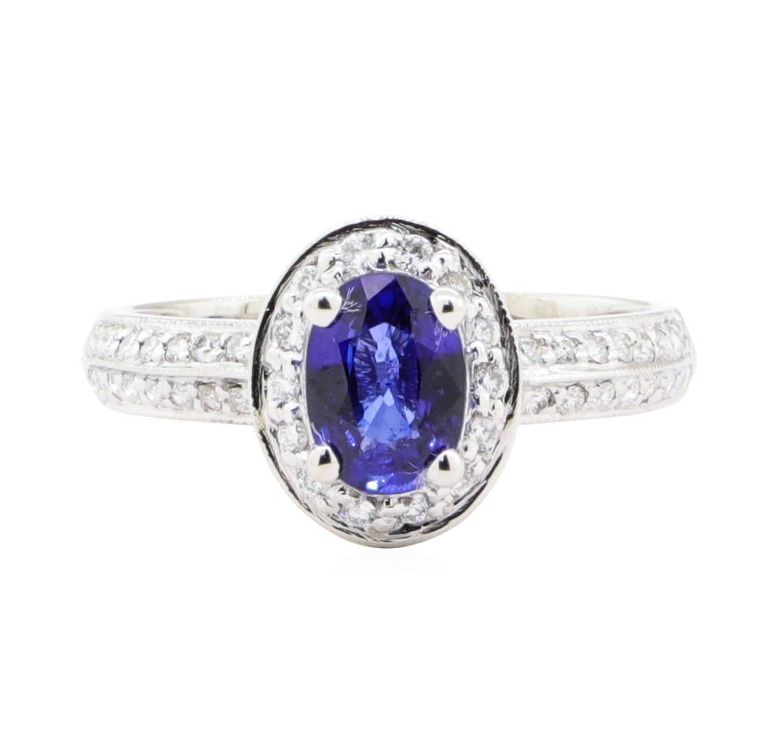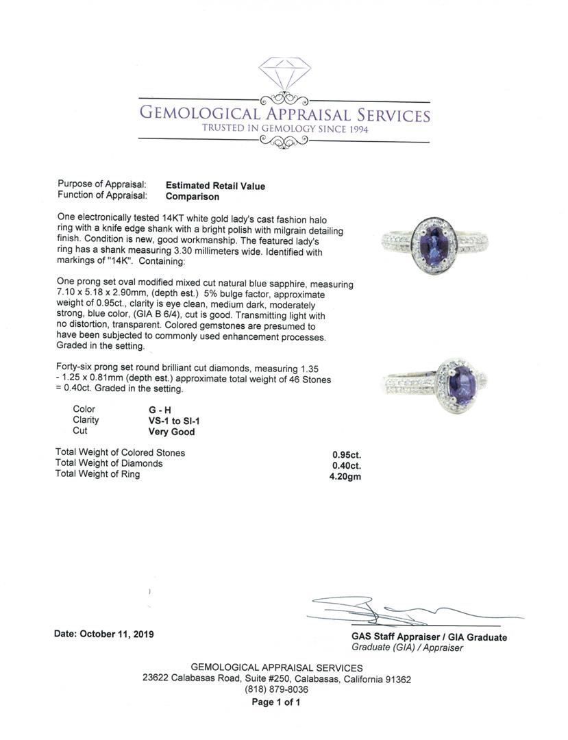 One electronically tested 14KT white gold lady's cast fashion halo ring with a knife edge shank with a bright polish with milgrain detailing finish. The featured lady's ring has a shank measuring 3.30 millimeters wide. Identified with markings of '14K'. Condition is new, good workmanship. Containing: One prong set oval modified mixed cut natural blue sapphire, measuring 7.10 x 5.18 x 2.90mm, (depth est.) 5%. bulge factor, approximate weight of 0.95ct., clarity is eye clean, medium dark, moderately strong, blue color, (GIA B 6/4), cut is good. Transmitting light with no distortion, transparent. Colored gemstones are presumed to have been subjected to commonly used enhancement processes. Graded in the setting. Forty-Six prong set round brilliant cut diamonds, measuring 1.35 - 1.25 x 0.81mm (depth est.) approximate total weight of 46 Stones = 0.40ct. Graded in the setting. Color G - H Clarity VS-1 to SI-1 Cut Very Good. Total Weight of Colored Stones 0.95ct.. Total Weight of Diamonds 0.40ct.. Total Weight of Ring 4.20gm GAS Appraised at $3660.00. GAS Appraised.