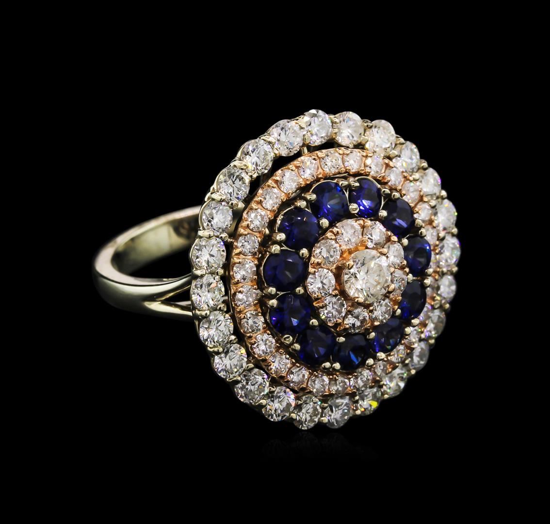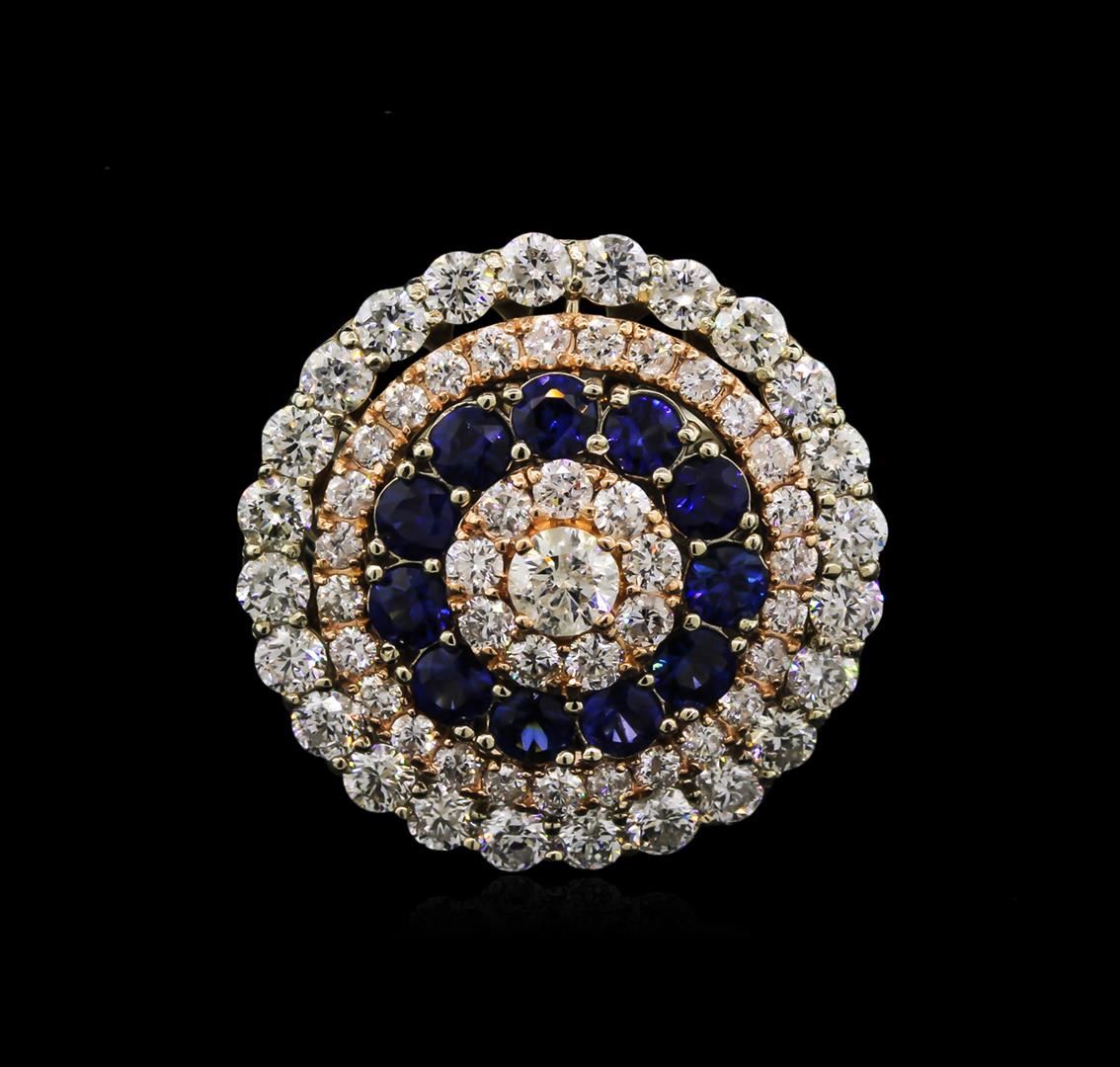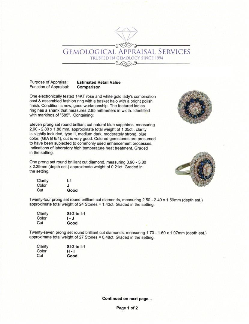 One electronically tested 14KT rose and white gold lady's combination cast & assembled fashion ring with a basket halo with a bright polish finish. The featured ladies ring has a shank that measures 2.95 millimeters in width. Identified with markings of "585". Condition is new, good workmanship. Containing: Eleven prong set round brilliant cut natural blue sapphires, measuring 2.90 - 2.80 x 1.86 mm, approximate total weight of 1.35ct., clarity is slightly included, type II, medium dark, moderately strong, blue color, (GIA B 6/4), cut is very good. Colored gemstones are presumed to have been subjected to commonly used enhancement processes. Indications of laboratory high temperature heat treatment. Graded in the setting. One prong set round brilliant cut diamond, measuring 3.90 - 3.80 x 2.39mm (depth est.) approximate weight of 0.21ct. Graded in the setting. Clarity: I-1. Color: Good Twenty-Four prong set round brilliant cut diamonds, measuring 2.50 - 2.40 x 1.59mm (depth est.) approximate total weight of 24 Stones = 1.43ct. Graded in the setting. Clarity: SI-2 to I-1. Color: I - Good Twenty-Seven prong set round brilliant cut diamonds, measuring 1.70 - 1.60 x 1.07mm (depth est.) approximate total weight of 27 Stones = 0.48ct. Graded in the setting. Clarity: SI-2 to I-1. Color: H - I. Cut Good Nine prong set round brilliant cut diamonds, measuring 2.40 - 2.30 x 1.53mm (depth est.) approximate total weight of 9 Stones = 0.48ct. Graded in the setting. Clarity: SI-2 to I-1. Color: H - I. Cut Good. Total Weight of Colored Stones 1.35ct. Total Weight of Diamonds 2.60ct. Total Weight of Ring 8.00gm. GAS Appraised.