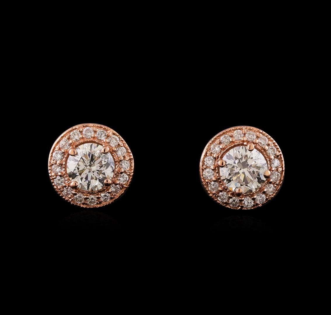 One pair electronically tested 14KT rose gold lady's combination cast & assembled halo earrings with medium friction backs with a bright polish with milgrain detailing finish. Identified with markings of "K14". Condition is new, good workmanship. Containing: Two prong set round brilliant cut diamonds, measuring 5.15 - 5.10 x 3.18mm (depth est.) , 5.00.%. GTCF approximate total weight of 2 Stones = 1.11ct. Graded in the setting. Clarity: SI-1 to SI-2. Color: I - J. Cut Very Good Thirty-Two prong set round brilliant cut diamonds, measuring 1.30 - 1.25 x 0.79mm (depth est.) approximate total weight of 32 Stones = 0.25ct. Graded in the setting. Clarity: SI-1 to SI-2. Color: H - I. Cut Good. Total Weight of Diamonds 1.36ct. Total Weight of Earrings 2.90gm. GAS Appraised.