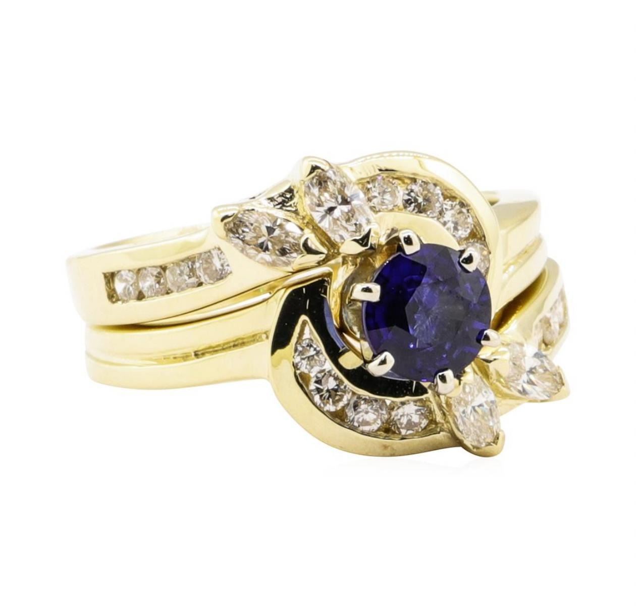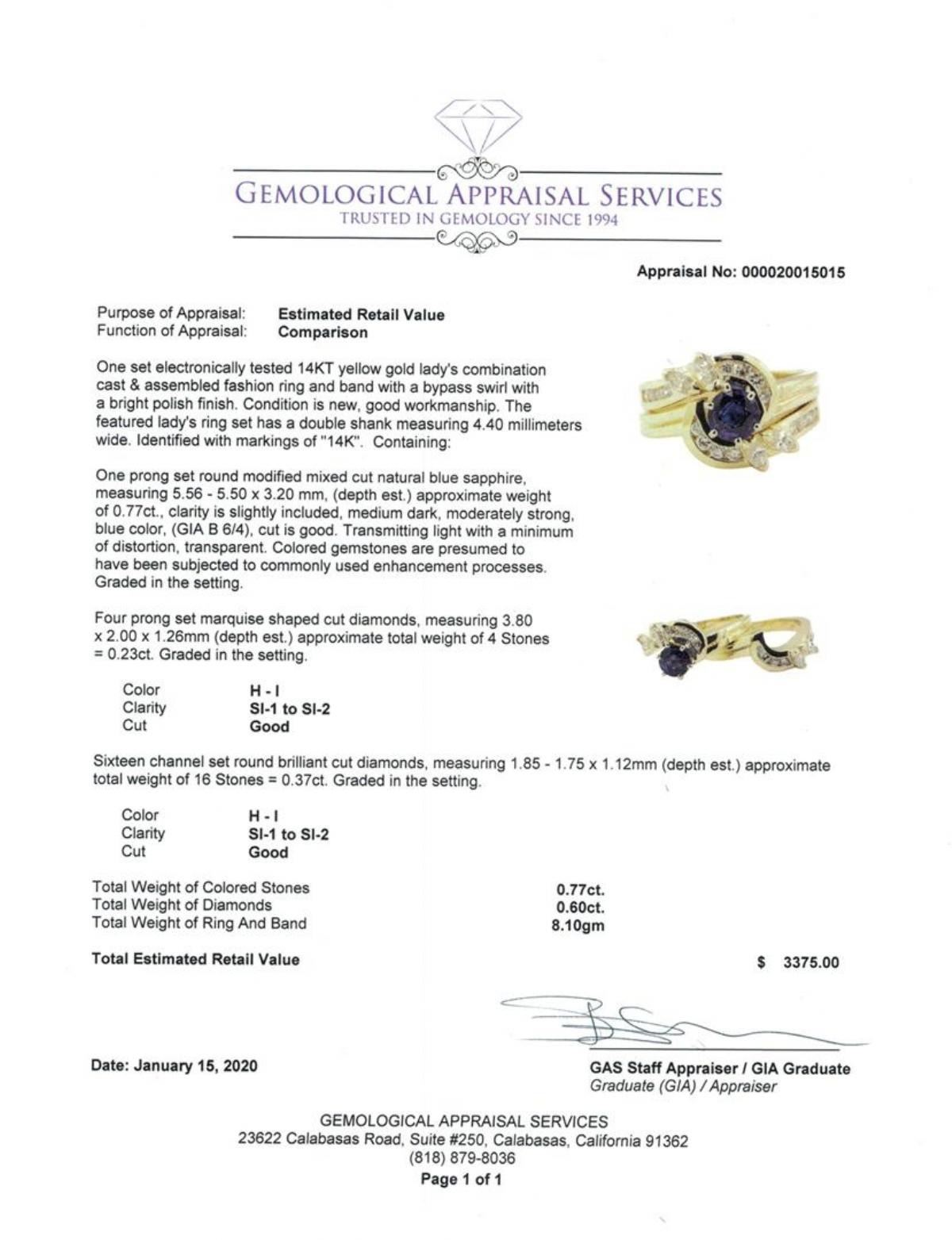 One set electronically tested 14KT yellow gold lady's combination cast & assembled fashion ring and band with a bypass swirl with a bright polish finish. The featured lady's ring set has a double shank measuring 4.40 millimeters wide. Identified with markings of '14K'. Condition is new, good workmanship. Containing: One prong set round modified mixed cut natural blue sapphire, measuring 5.56 - 5.50 x 3.20 mm, (depth est.) approximate weight of 0.77ct., clarity is slightly included, medium dark, moderately strong, blue color, (GIA B 6/4), cut is good. Transmitting light with a minimum of distortion, transparent. Colored gemstones are presumed to have been subjected to commonly used enhancement processes. Graded in the setting. Four prong set marquise shaped cut diamonds, measuring 3.80 x 2.00 x 1.26mm (depth est.) approximate total weight of 4 Stones = 0.23ct. Graded in the setting. Color H - I Clarity SI-1 to SI-2 Cut Good Sixteen channel set round brilliant cut diamonds, measuring 1.85 - 1.75 x 1.12mm (depth est.) approximate total weight of 16 Stones = 0.37ct. Graded in the setting. Color H - I Clarity SI-1 to SI-2 Cut Good. Total Weight of Colored Stones 0.77ct.. Total Weight of Diamonds 0.60 ct.. Total Weight of Ring And Band 8.10gm GAS Appraised at $3375.00. GAS Appraised.