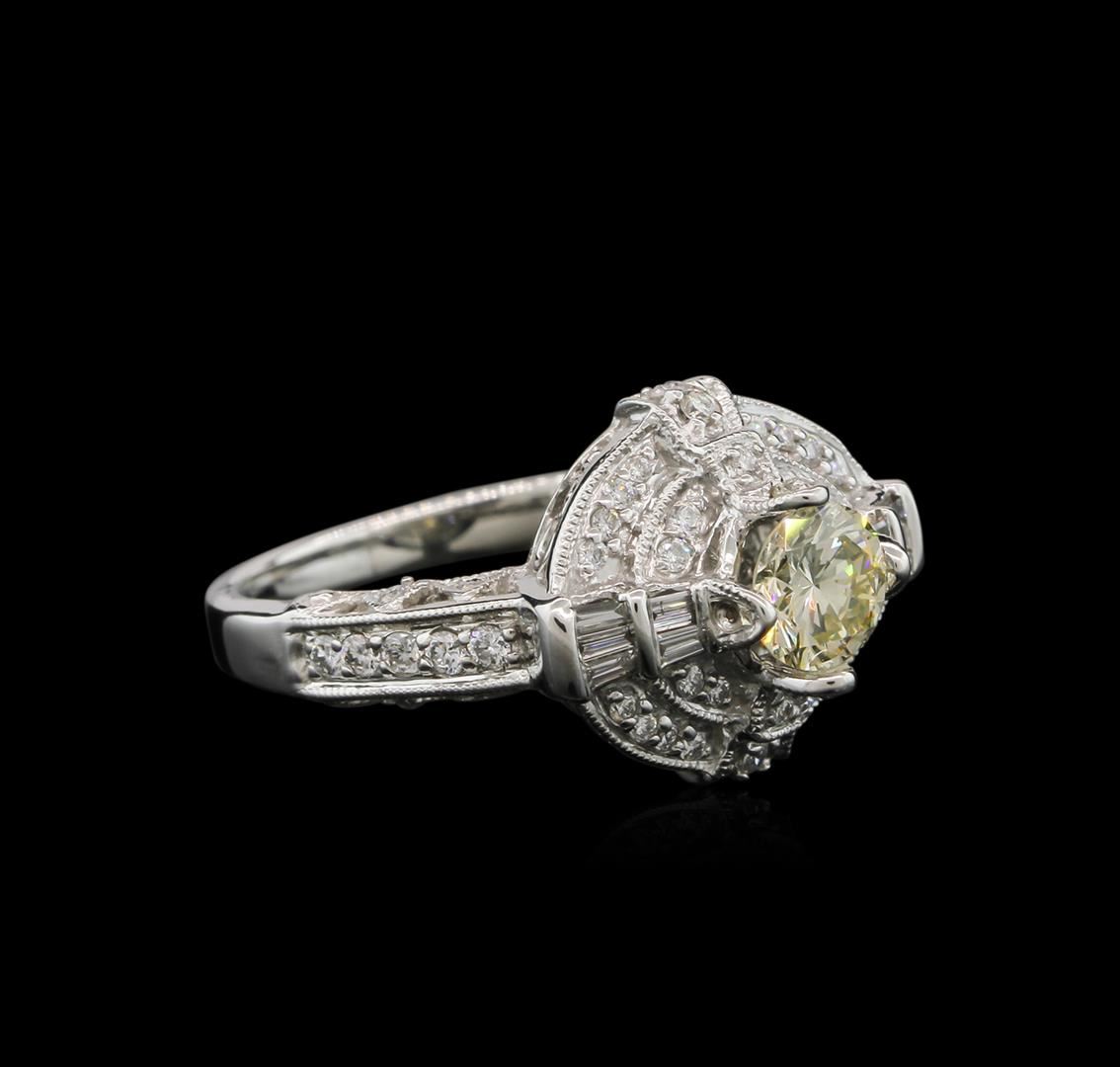 One electronically tested 14KT white gold ladies cast diamond engagement ring with a bright polish finish. Identified with markings of "14K". Condition is new. Containing: One prong set round brilliant cut diamond, measuring 5.40 - 5.40 x 3.24mm (depth est.) approximate weight of 0.69ct. Clarity: SI-1, Cut is Good. Ten channel set baguette cut (tapered) diamonds, measuring 2.00 x 1.30 x 1.11mm (depth est.) approximate total weight of 10 Stones = 0.26ct. Clarity: VS-2. Color: I - J, Cut is Good. Fifty-Two prong set round brilliant cut diamonds, measuring 1.30 - 1.30 x 0.78mm (depth est.) approximate total weight of 52 Stones = 0.42ct. Clarity: SI-2 to I-1. Color: J - K, Cut is Good. Diamonds are graded in the mounting, unless otherwise stated. Total Weight of Diamonds 1.37ct. Total Weight of Engagement Ring 6.00 grams. GGL Appraised.