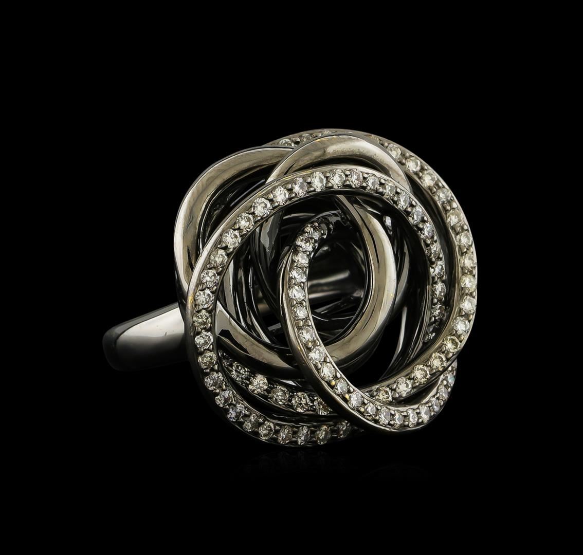 One electronically tested 18KT white & black rhodium plated gold lady's combination cast & assembled fashion ring with a bright polish finish. The featured lady's ring has a shank measuring 2.95 millimeters wide. Identified with markings of "18K". Condition is new, good workmanship. Containing: One Hundred Fifteen prong set round brilliant cut diamonds, measuring 1.50 - 1.40 x 0.90mm (depth est.) approximate total weight of 115 Stones = 1.37ct. Graded in the setting. Clarity: SI-1 to SI-2. Color: H - I. Cut Very Good. Total Weight of Diamonds 1.37ct. Total Weight of Ring 14.90gm GAS Appraised.