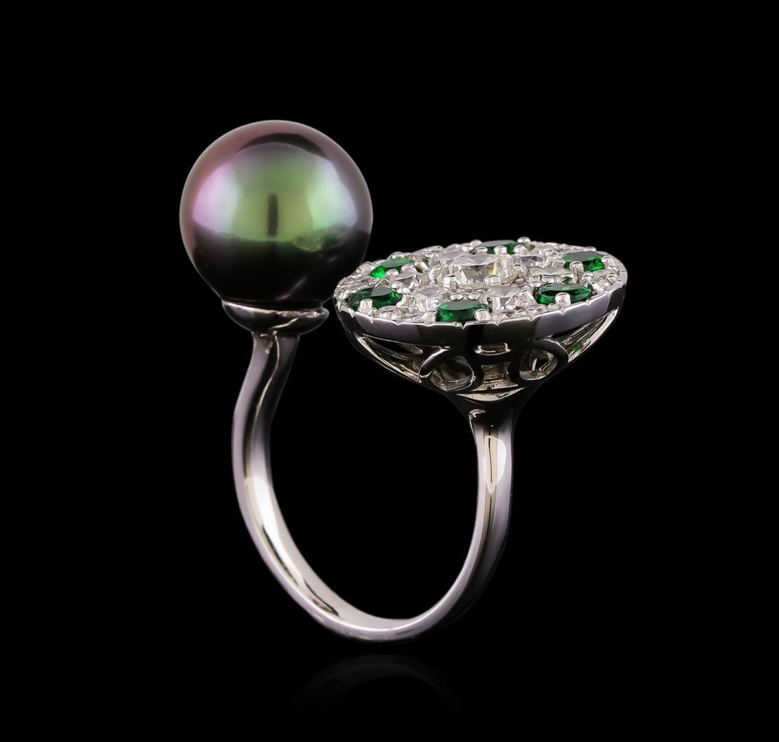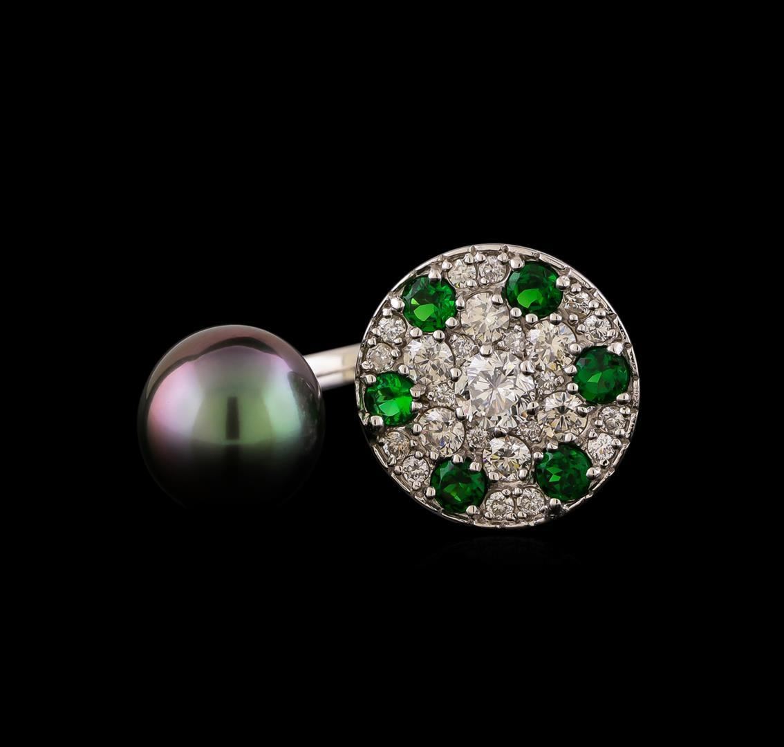 One electronically tested 14KT white gold lady's cast fashion ring with a bright polish finish. The featured lady's ring has a cuff motif with a shank measuring 2.40 millimeters wide. Identified with markings of "K14". Condition is new, good workmanship. Containing: One Tahitian pearl, 11.4mm to 11.1mm in size. The pearl is black in color, green overtone with a good luster, round to near round, and clean. Graded in the setting. Six prong set round modified brilliant cut natural tsavorite garnets, measuring 3.20 - 3.10 x 2.06 mm, (depth est.) approximate total weight of 0.90ct., clarity is eye clean, medium dark, moderately strong, green color, (GIA G 6/4), cut is very good. Transmitting light with no distortion, transparent. Colored gemstones are presumed to have been subjected to commonly used enhancement processes. Graded in the setting. One prong set round brilliant cut diamond, measuring 5.08 - 4.95 x 3.16mm (depth est.) , 5.00.%. GTCF approximate weight of 0.50ct. Graded in the setting. Clarity: SI-1. Color: H - I. Cut Very Good Six prong set round brilliant cut diamonds, measuring 3.00 - 2.90 x 1.83mm (depth est.) approximate total weight of 6 Stones = 0.58ct. Graded in the setting. Clarity: VS-2 to SI-2. Color: H - I. Cut Good Twelve prong set round brilliant cut diamonds, measuring 1.70 - 1.65 x 1.04mm (depth est.) approximate total weight of 12 Stones = 0.22ct. Graded in the setting. Clarity: SI-1 to SI-2. Color: G - Good Six prong set round brilliant cut diamonds, measuring 1.50 - 1.40 x 0.90mm (depth est.) approximate total weight of 6 Stones = 0.07ct. Clarity: SI-1 to SI-2. Color: G - Good. Total Weight of Colored Stones 0.90ct. Total Weight of Diamonds 1.37ct. Total Weight of Ring 8.00gm. GAS Appraised.