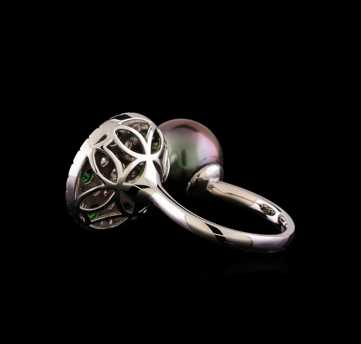 One electronically tested 14KT white gold lady's cast fashion ring with a bright polish finish. The featured lady's ring has a cuff motif with a shank measuring 2.40 millimeters wide. Identified with markings of "K14". Condition is new, good workmanship. Containing: One Tahitian pearl, 11.4mm to 11.1mm in size. The pearl is black in color, green overtone with a good luster, round to near round, and clean. Graded in the setting. Six prong set round modified brilliant cut natural tsavorite garnets, measuring 3.20 - 3.10 x 2.06 mm, (depth est.) approximate total weight of 0.90ct., clarity is eye clean, medium dark, moderately strong, green color, (GIA G 6/4), cut is very good. Transmitting light with no distortion, transparent. Colored gemstones are presumed to have been subjected to commonly used enhancement processes. Graded in the setting. One prong set round brilliant cut diamond, measuring 5.08 - 4.95 x 3.16mm (depth est.) , 5.00.%. GTCF approximate weight of 0.50ct. Graded in the setting. Clarity: SI-1. Color: H - I. Cut Very Good Six prong set round brilliant cut diamonds, measuring 3.00 - 2.90 x 1.83mm (depth est.) approximate total weight of 6 Stones = 0.58ct. Graded in the setting. Clarity: VS-2 to SI-2. Color: H - I. Cut Good Twelve prong set round brilliant cut diamonds, measuring 1.70 - 1.65 x 1.04mm (depth est.) approximate total weight of 12 Stones = 0.22ct. Graded in the setting. Clarity: SI-1 to SI-2. Color: G - Good Six prong set round brilliant cut diamonds, measuring 1.50 - 1.40 x 0.90mm (depth est.) approximate total weight of 6 Stones = 0.07ct. Clarity: SI-1 to SI-2. Color: G - Good. Total Weight of Colored Stones 0.90ct. Total Weight of Diamonds 1.37ct. Total Weight of Ring 8.00gm. GAS Appraised.
