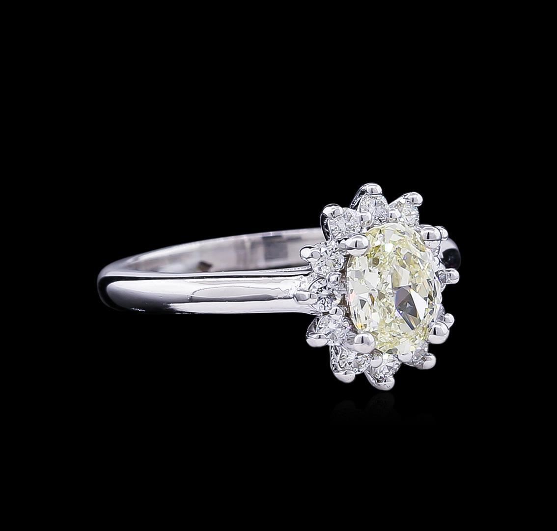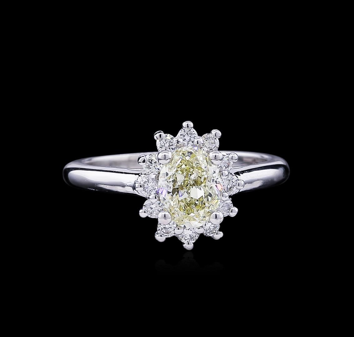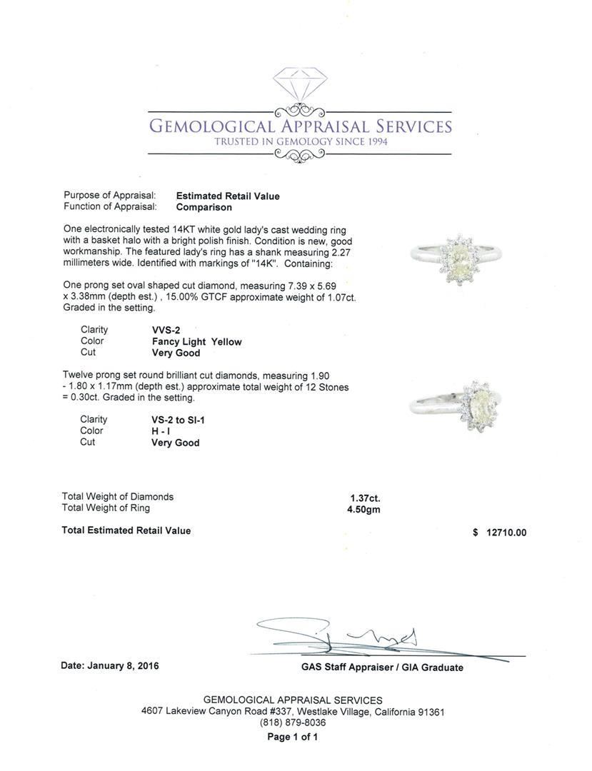 One electronically tested 14KT white gold lady's cast wedding ring with a basket halo with a bright polish finish. The featured lady's ring has a shank measuring 2.27 millimeters wide. Identified with markings of "14K". Condition is new, good workmanship. Containing: One prong set oval shaped cut diamond, measuring 7.39 x 5.69 x 3.38mm (depth est.) , 15.00.%. GTCF approximate weight of 1.07ct. Graded in the setting. Clarity: VVS-2 Cut Very Good Twelve prong set round brilliant cut diamonds, measuring 1.90 - 1.80 x 1.17mm (depth est.) approximate total weight of 12 Stones = 0.30ct. Graded in the setting. Clarity: VS-2 to SI-1. Color: H - I. Cut Very Good. Total Weight of Diamonds 1.37ct. Total Weight of Ring 4.50gm. GAS Appraised.