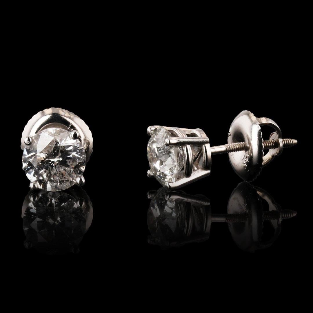One pair electronically tested 14KT white gold cast and assembled diamond solitaire earrings with screw backs. Condition is new, good workmanship. Identified with markings of "14K". Containing: One prong set early modern brilliant cut diamond, measuring 5.50mm to 5.50mm x 3.16mm (depth est.) approximate weight of 0.65ct. Graded in the setting. Clarity I2 Color I Depth 57.5% Table 50.9% Polish Good Symmetry Good One prong set round brilliant cut diamond, measuring 5.60 - 5.60 x 3.60mm (depth est.) approximate weight of 0.73ct with a medium blue fluorescence. Graded in the setting. Clarity I2 Color I Depth 64.3% Table 58.6% Polish Good Symmetry Good Total Weight of Diamonds 1.38ct. Total Weight of Earrings 1.00 gm