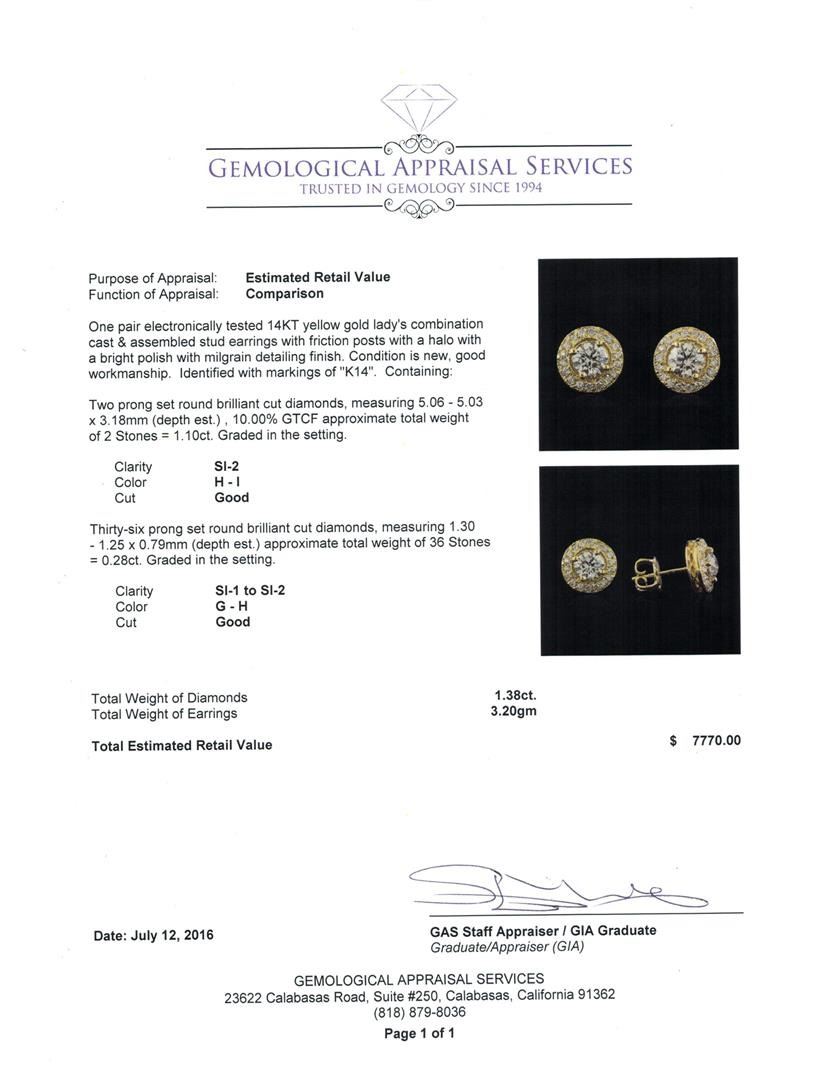 One pair electronically tested 14KT yellow gold lady's combination cast & assembled stud earrings with friction posts with a halo with a bright polish with milgrain detailing finish. Identified with markings of 'K14'. Condition is new, good workmanship. Containing: Two prong set round brilliant cut diamonds, measuring 5.06 - 5.03 x 3.18mm (depth est.) , 10.00.%. GTCF approximate total weight of 2 Stones = 1.10 ct. Graded in the setting. Clarity SI-2. Color: H - I Cut Good Thirty-Six prong set round brilliant cut diamonds, measuring 1.30 - 1.25 x 0.79mm (depth est.) approximate total weight of 36 Stones = 0.28ct. Graded in the setting. Clarity SI-1 to SI-2. Color: G - H Cut Good. Total Weight of Diamonds 1.38ct.. Total Weight of Earrings 3.20gm. GAS Appraised.