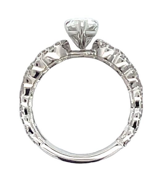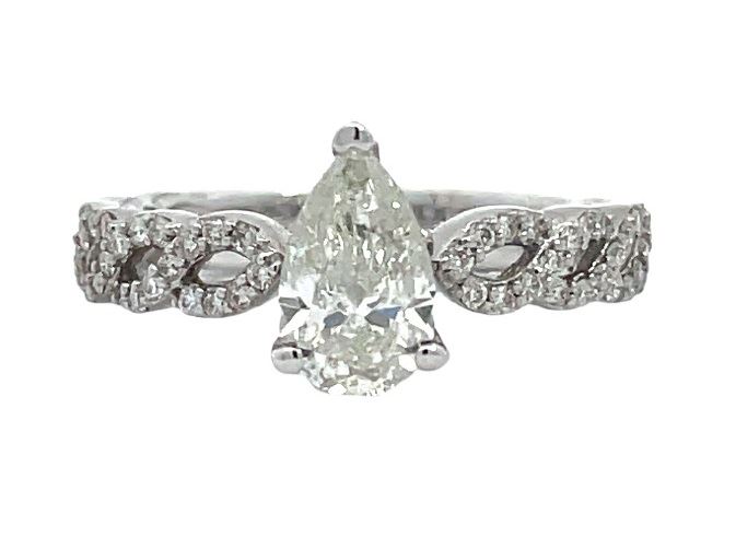 One electronically tested 14KT white gold lady's combination cast & assembled fashion twist motif wedding ring with a twist down the straightline shank with a bright polish with milgrain detailing finish. The featured lady's ring has a shank measuring 3.30 millimeters wide. Identified with markings of "14K". Condition is new, good workmanship. Containing: One prong set pear shaped cut diamond, measuring 9.00 x 5.35 x 3.37mm (depth est.) , 7.00% GTCF approximate weight of 1.00ct. Graded in the setting. Color H - I Clarity I-1 Cut Very Good Eighty prong set round brilliant cut diamonds, measuring 1.10 - 1.05 x 0.67mm (depth est.) approximate total weight of 80 Stones = 0.38ct. Graded in the setting. Color H - I Clarity VS-2 to SI-2 Cut Very Good Total Weight of Diamonds 1.38ct. Total Weight of Wedding Ring 3.70gm