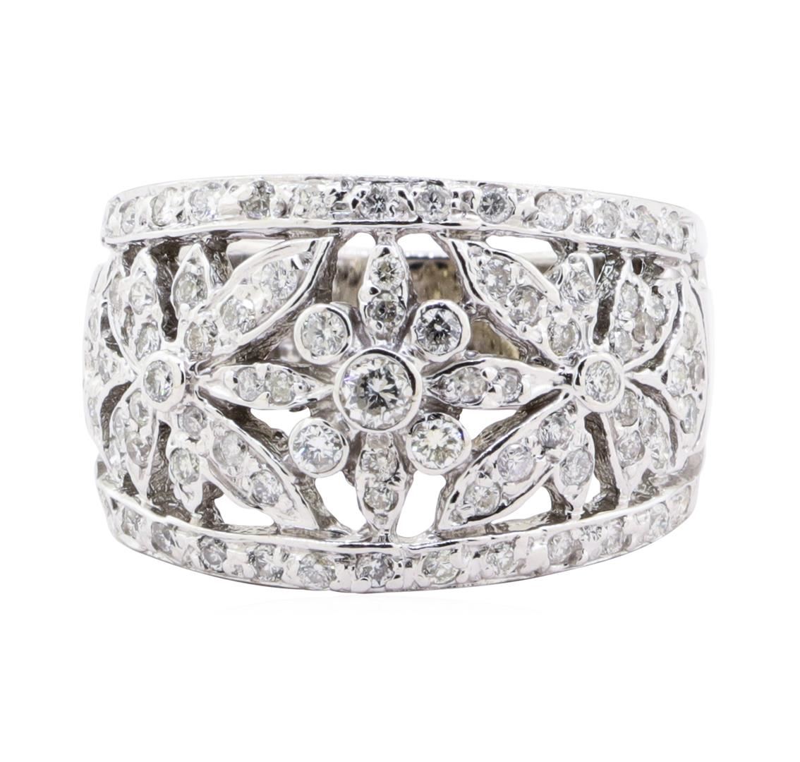 One wide band floral ring featuring: 14KT white gold weighing 7.3 grams containing diamonds weighing 1.38ctw.