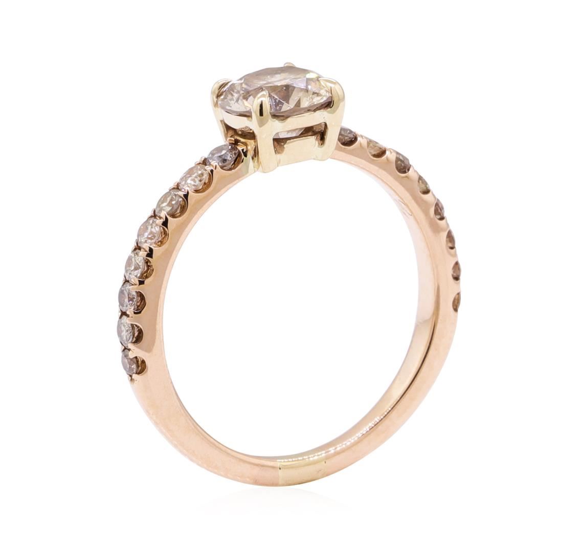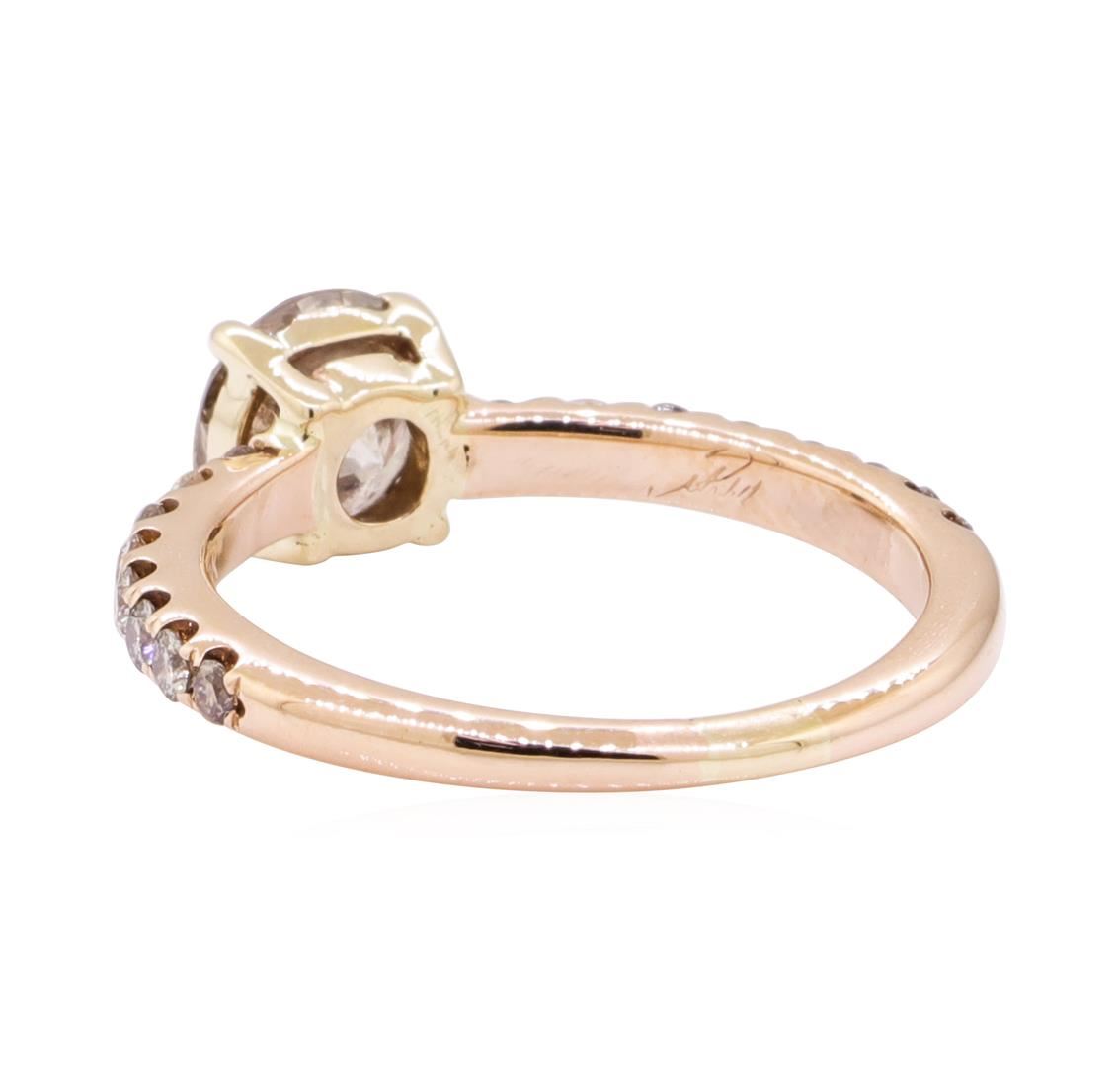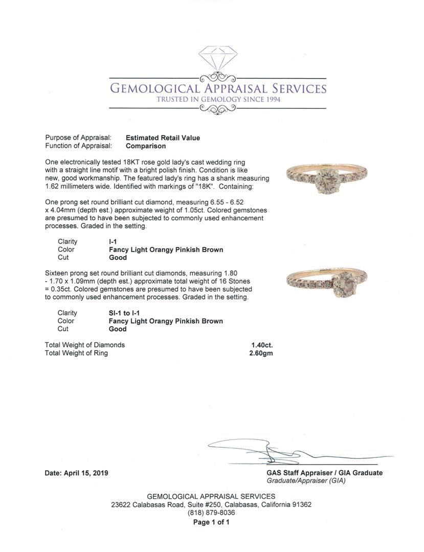 One electronically tested 18KT rose gold lady's cast wedding ring with a straight line motif with a bright polish finish. The featured lady's ring has a shank measuring 1.62 millimeters wide. Identified with markings of '18K'. Condition is like new, good workmanship. Containing: One prong set round brilliant cut diamond, measuring 6.55 - 6.52 x 4.04mm (depth est.) approximate weight of 1.05ct. Colored gemstones are presumed to have been subjected to commonly used enhancement processes. Graded in the setting. Color Fancy Light Orangy Pinkish Brown Clarity I-1 Cut Good Sixteen prong set round brilliant cut diamonds, measuring 1.80 - 1.70 x 1.09mm (depth est.) approximate total weight of 16 Stones = 0.35ct. Colored gemstones are presumed to have been subjected to commonly used enhancement processes. Graded in the setting. Color Fancy Light Orangy Pinkish Brown Clarity SI-1 to I-1 Cut Good. Total Weight of Diamonds 1.40ct.. Total Weight of Ring 2.60gm GAS Appraised at $7285.00. GAS Appraised.
