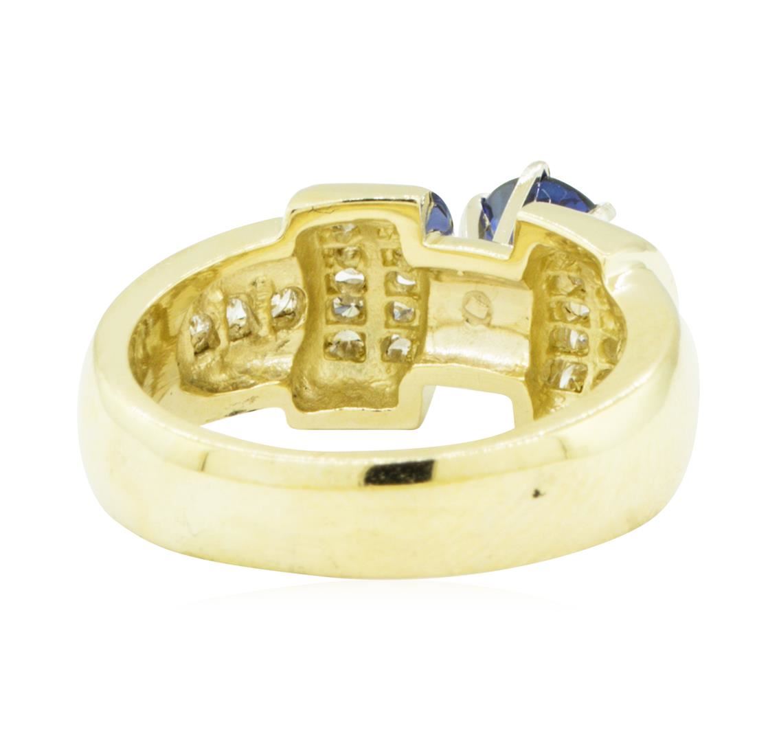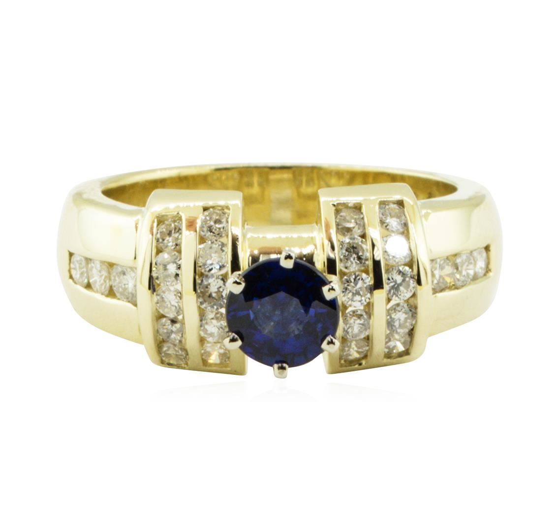 One electronically tested 14KT yellow gold lady's combination cast & assembled fashion ring with a double cuffs with a bright polish finish. The featured lady's ring has a shank measuring 4.50 millimeters in width. Identified with markings of '14K'. Condition is new, good workmanship. Containing: One prong set round modified brilliant cut natural blue sapphire, measuring 5.50 - 5.43 x 3.28 mm, (depth est.) approximate weight of 0.79ct., clarity is eye clean, medium, moderately strong, violetish blue color, (GIA vB 5/4), cut is poor. Transmitting light with no distortion, transparent. Colored gemstones are presumed to have been subjected to commonly used enhancement processes. Graded in the setting. Six channel set round brilliant cut diamonds, measuring 2.10 - 2.00 x 1.24mm (depth est.) approximate total weight of 6 Stones = 0.19ct. Graded in the setting. Color H - I Clarity SI-1 to SI-2 Cut Good Twenty channel set round brilliant cut diamonds, measuring 1.80 - 1.75 x 1.09mm (depth est.) approximate total weight of 20 Stones = 0.42ct. Graded in the setting. Color G - I Clarity SI-1 to SI-2 Cut Good. Total Weight of Colored Stones 0.79ct.. Total Weight of Diamonds 0.61ct.. Total Weight of Ring 8.50gm GAS Appraised at $3345.00. GAS Appraised.