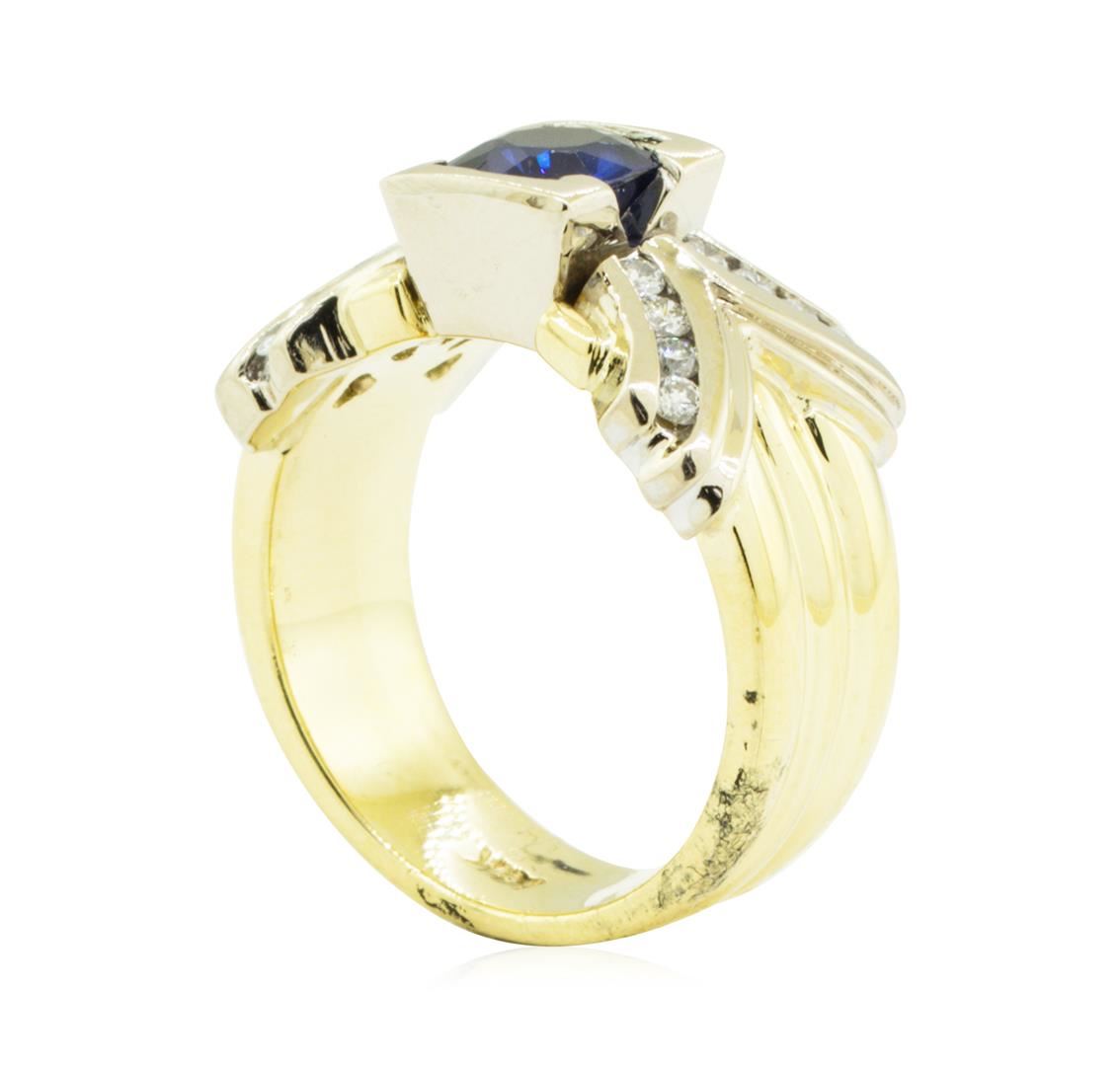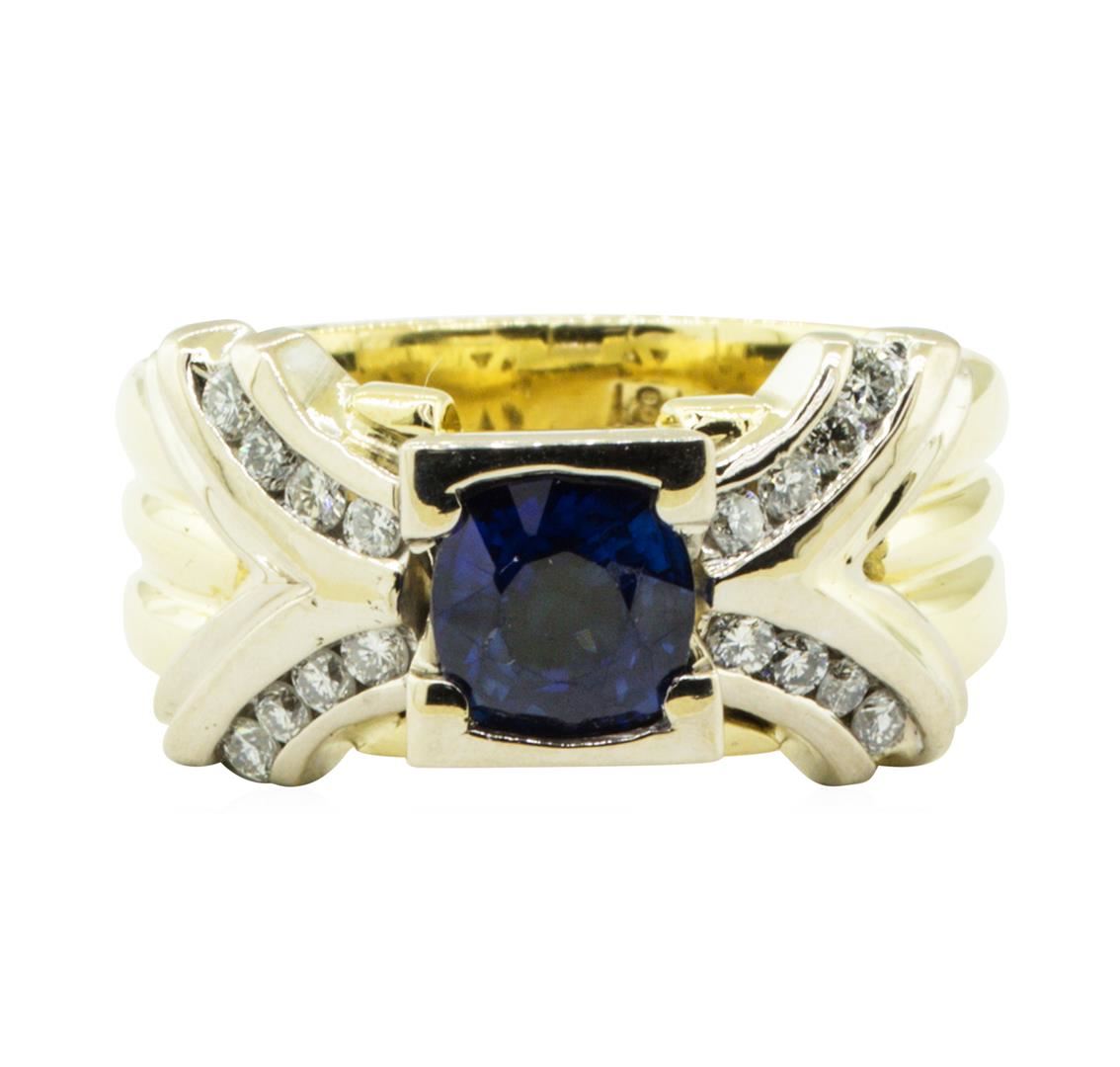 One electronically tested 18KT yellow and white gold lady's combination cast & assembled fashion bow ring with a three row wide shank with a bright polish finish. The featured lady's ring has a shank measuring 5.80 millimeters in width. Identified with markings of '18K'. Condition is like new, good workmanship. Containing: One channel set round modified brilliant cut natural blue sapphire, measuring 6.10 - 6.00 x 3.69 mm, (depth est.) approximate weight of 1.09ct., clarity is eye clean, medium dark, moderately strong, violetish blue color, (GIA vB 6/4), cut is very good. Transmitting light with no distortion, transparent. Colored gemstones are presumed to have been subjected to commonly used enhancement processes. Graded in the setting. Sixteen channel set round brilliant cut diamonds, measuring 1.80 - 1.70 x 1.05mm (depth est.) approximate total weight of 16 Stones = 0.32ct. Graded in the setting. Color F - G Clarity VS-1 to SI-1 Cut Very Good. Total Weight of Colored Stones 1.09ct.. Total Weight of Diamonds 0.32ct.. Total Weight of Ring 12.70gm GAS Appraised at $4740.00. GAS Appraised.