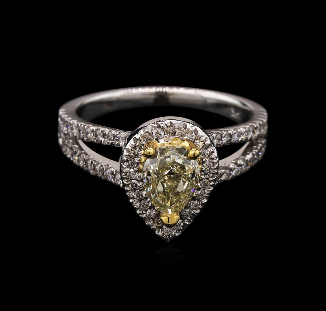 One electronically tested 14KT white gold ladies cast diamond ring with a bright polish finish. The featured diamond is set within an inner yellow gold basket and an outer diamond bezel supported by diamond set split shoulders, completed by a two millimeter wide band. Identified with markings of "14K". Condition is new, good workmanship. Containing: One prong set pear shaped cut diamond, measuring 7.30 x 5.30 x 3.50mm, 12.00.%. GTCF exact weight 1.05ct with a faint blue fluorescence. Graded in the setting. Clarity: SI-1. Depth: 66.0%. Table 56.6%. Sixty-Eight prong set round brilliant cut diamonds, measuring 1.20 - 1.00 x 0.66mm exact total weight 68 Stones = 0.37ct. Graded in the setting. Clarity: SI-1 to I-1. Color: G - I. Total Weight of Diamonds 1.42ct. Total Weight of Ring 4.59gm. AIG Appraised at $7,330.00.