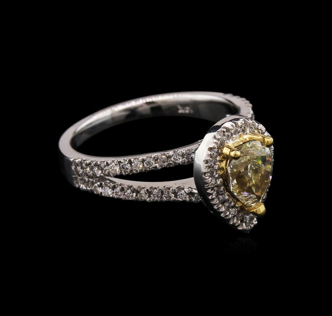 One electronically tested 14KT white gold ladies cast diamond ring with a bright polish finish. The featured diamond is set within an inner yellow gold basket and an outer diamond bezel supported by diamond set split shoulders, completed by a two millimeter wide band. Identified with markings of "14K". Condition is new, good workmanship. Containing: One prong set pear shaped cut diamond, measuring 7.30 x 5.30 x 3.50mm, 12.00.%. GTCF exact weight 1.05ct with a faint blue fluorescence. Graded in the setting. Clarity: SI-1. Depth: 66.0%. Table 56.6%. Sixty-Eight prong set round brilliant cut diamonds, measuring 1.20 - 1.00 x 0.66mm exact total weight 68 Stones = 0.37ct. Graded in the setting. Clarity: SI-1 to I-1. Color: G - I. Total Weight of Diamonds 1.42ct. Total Weight of Ring 4.59gm. AIG Appraised.