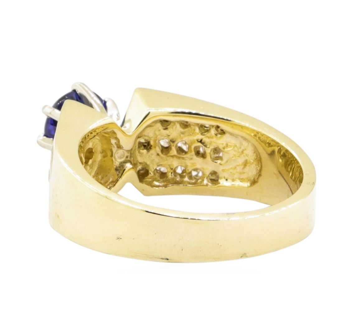 One electronically tested 14KT yellow gold lady's combination cast & assembled fashion ring with a three row cathedral shank with a bright polish finish. The featured lady's ring has a shank measuring 3.60 millimeters wide. Identified with markings of '14K'. Condition is new, good workmanship. Containing: One prong set round modified mixed cut natural blue sapphire, measuring 5.74 - 5.65 x 3.20 mm, (depth est.) approximate weight of 0.84ct., clarity is slightly included, medium dark, very slightly grayish, blue color, (GIA B 6/3), cut is good. Transmitting light with a minimum of distortion, transparent. Colored gemstones are presumed to have been subjected to commonly used enhancement processes. Graded in the setting. Twenty-Four channel set round brilliant cut diamonds, measuring 1.90 - 1.80 x 1.15mm (depth est.) approximate total weight of 24 Stones = 0.60ct. Graded in the setting. Color H - I Clarity SI-2 to I-1 Cut Good. Total Weight of Colored Stones 0.84ct.. Total Weight of Diamonds 0.60ct.. Total Weight of Ring 6.70gm GAS Appraised at $2900.00. GAS Appraised.