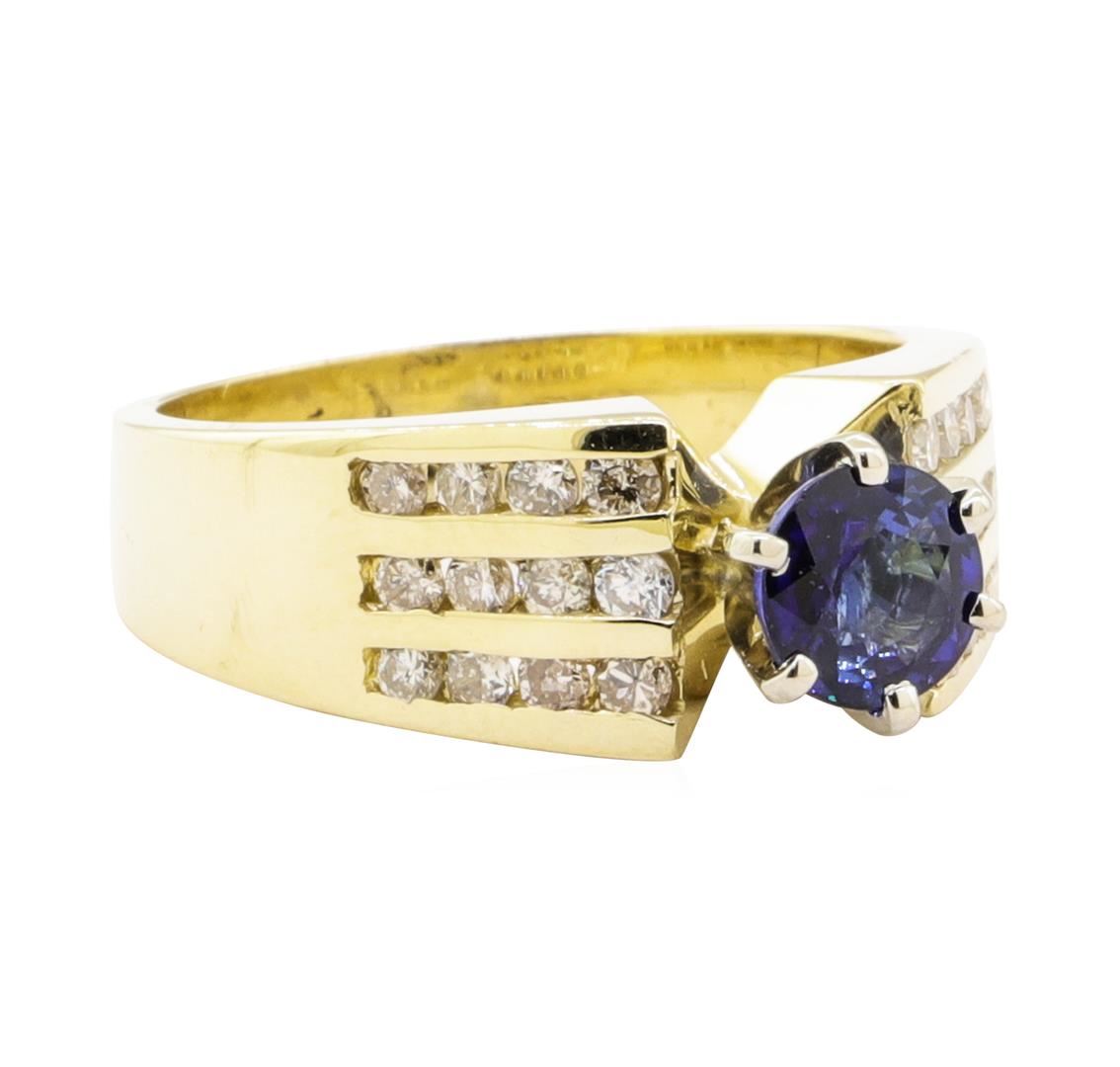 One electronically tested 14KT yellow gold lady's combination cast & assembled fashion ring with a three row cathedral shank with a bright polish finish. The featured lady's ring has a shank measuring 3.60 millimeters wide. Identified with markings of '14K'. Condition is new, good workmanship. Containing: One prong set round modified mixed cut natural blue sapphire, measuring 5.74 - 5.65 x 3.20 mm, (depth est.) approximate weight of 0.84ct., clarity is slightly included, medium dark, very slightly grayish, blue color, (GIA B 6/3), cut is good. Transmitting light with a minimum of distortion, transparent. Colored gemstones are presumed to have been subjected to commonly used enhancement processes. Graded in the setting. Twenty-Four channel set round brilliant cut diamonds, measuring 1.90 - 1.80 x 1.15mm (depth est.) approximate total weight of 24 Stones = 0.60ct. Graded in the setting. Color H - I Clarity SI-2 to I-1 Cut Good. Total Weight of Colored Stones 0.84ct.. Total Weight of Diamonds 0.60ct.. Total Weight of Ring 6.70gm GAS Appraised at $2900.00. GAS Appraised.
