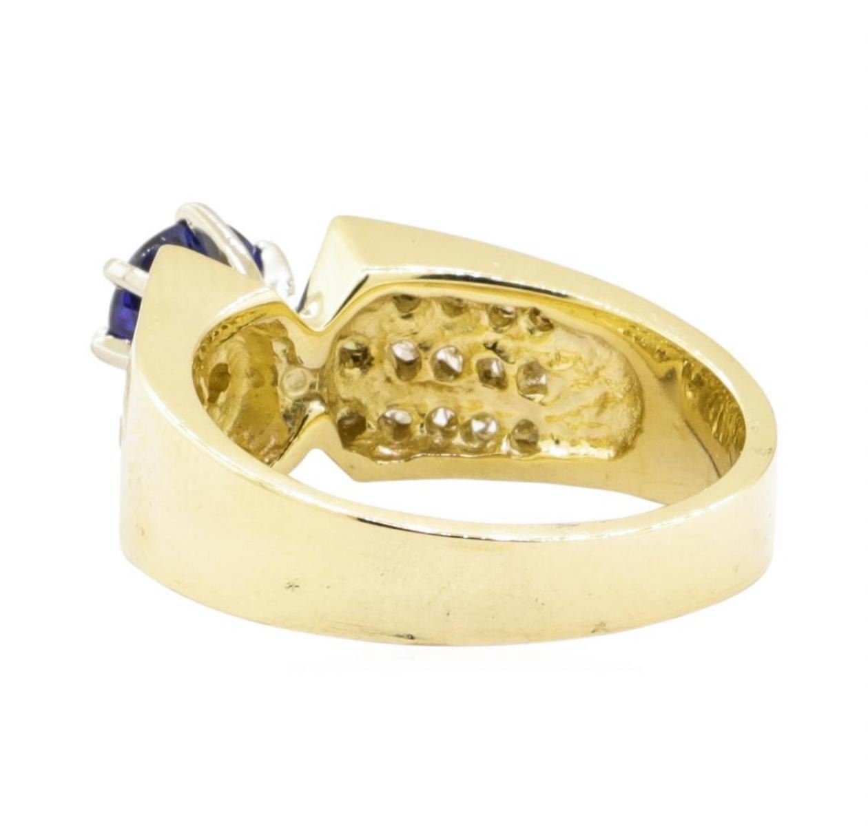 One electronically tested 14KT yellow gold lady's combination cast & assembled fashion ring with a three row cathedral shank with a bright polish finish. The featured lady's ring has a shank measuring 3.60 millimeters wide. Identified with markings of '14K'. Condition is new, good workmanship. Containing: One prong set round modified mixed cut natural blue sapphire, measuring 5.74 - 5.65 x 3.20 mm, (depth est.) approximate weight of 0.84ct., clarity is slightly included, medium dark, very slightly grayish, blue color, (GIA B 6/3), cut is good. Transmitting light with a minimum of distortion, transparent. Colored gemstones are presumed to have been subjected to commonly used enhancement processes. Graded in the setting. Twenty-Four channel set round brilliant cut diamonds, measuring 1.90 - 1.80 x 1.15mm (depth est.) approximate total weight of 24 Stones = 0.60 ct. Graded in the setting. Color H - I Clarity SI-2 to I-1 Cut Good. Total Weight of Colored Stones 0.84ct.. Total Weight of Diamonds 0.60 ct.. Total Weight of Ring 6.70gm GAS Appraised at $2900.00. GAS Appraised.