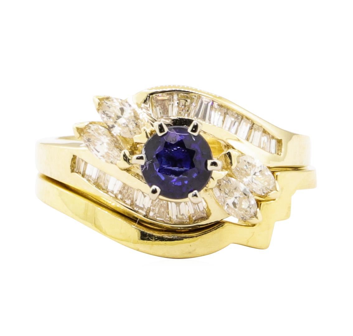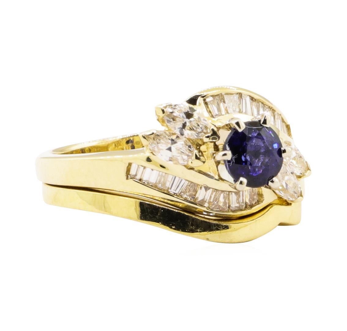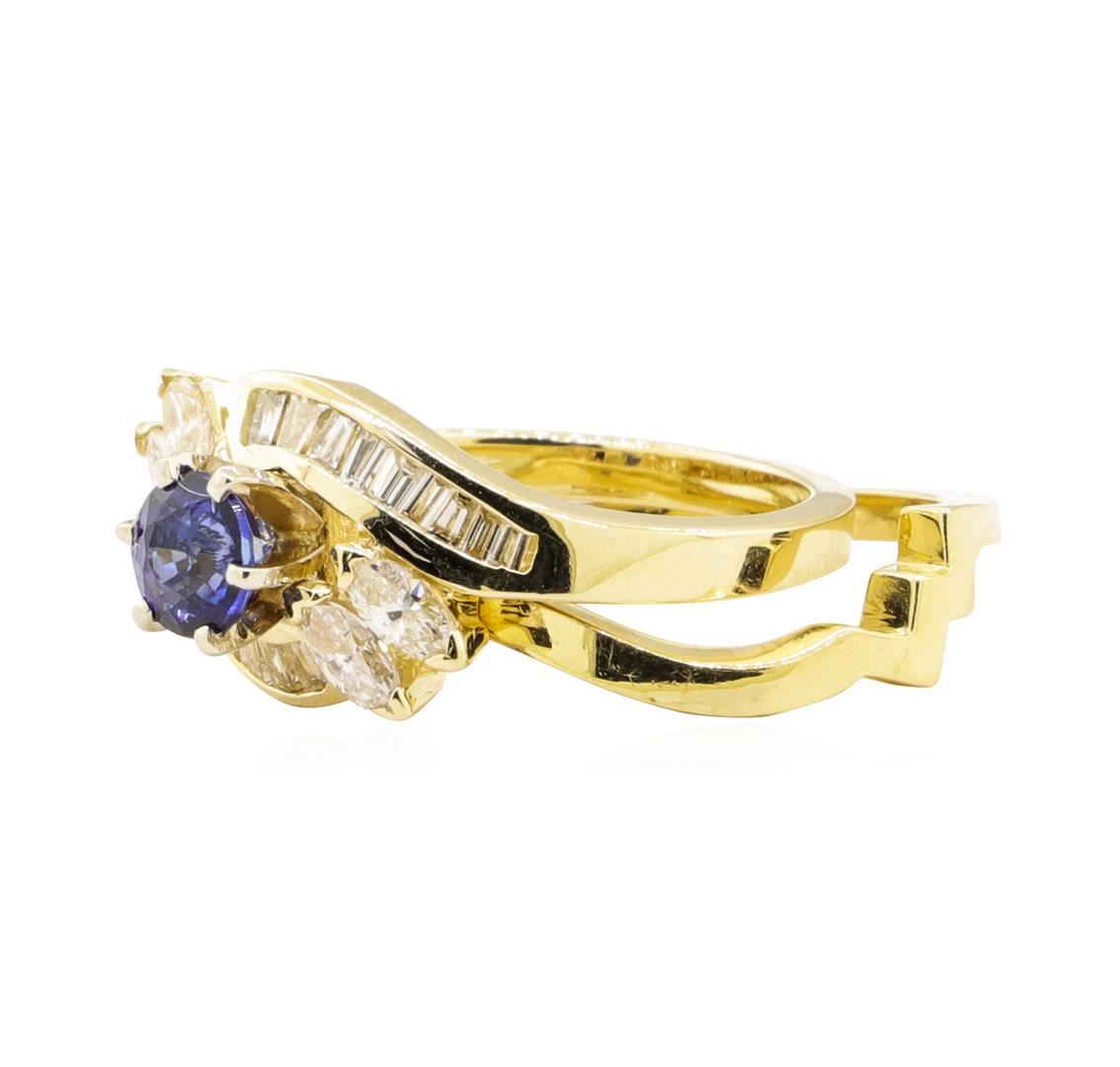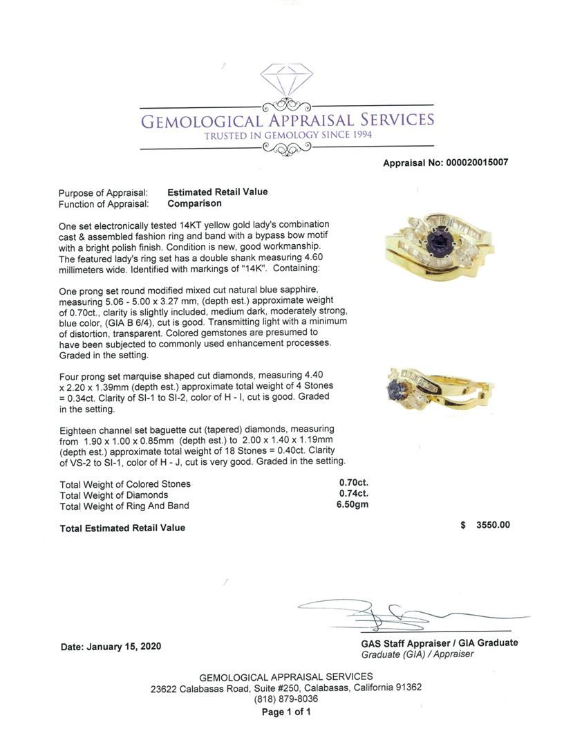 One set electronically tested 14KT yellow gold lady's combination cast & assembled fashion ring and band with a bypass bow motif with a bright polish finish. The featured lady's ring set has a double shank measuring 4.60 millimeters wide. Identified with markings of '14K'. Condition is new, good workmanship. Containing: One prong set round modified mixed cut natural blue sapphire, measuring 5.06 - 5.00 x 3.27 mm, (depth est.) approximate weight of 0.70ct., clarity is slightly included, medium dark, moderately strong, blue color, (GIA B 6/4), cut is good. Transmitting light with a minimum of distortion, transparent. Colored gemstones are presumed to have been subjected to commonly used enhancement processes. Graded in the setting. Four prong set marquise shaped cut diamonds, measuring 4.40 x 2.20 x 1.39mm (depth est.) approximate total weight of 4 Stones = 0.34ct. Graded in the setting. Color H - I Clarity SI-1 to SI-2 Cut Good Eighteen channel set baguette cut (tapered) diamonds, measuring from 1.90 x 1.00 x 0.85mm (depth est.) to 2.00 x 1.40 x 1.19mm (depth est.) approximate total weight of 18 Stones = 0.40ct. Graded in the setting. Color H - J Clarity VS-2 to SI-1 Cut Very Good. Total Weight of Colored Stones 0.70ct.. Total Weight of Diamonds 0.74ct.. Total Weight of Ring And Band 6.50gm GAS Appraised at $3550.00. GAS Appraised.