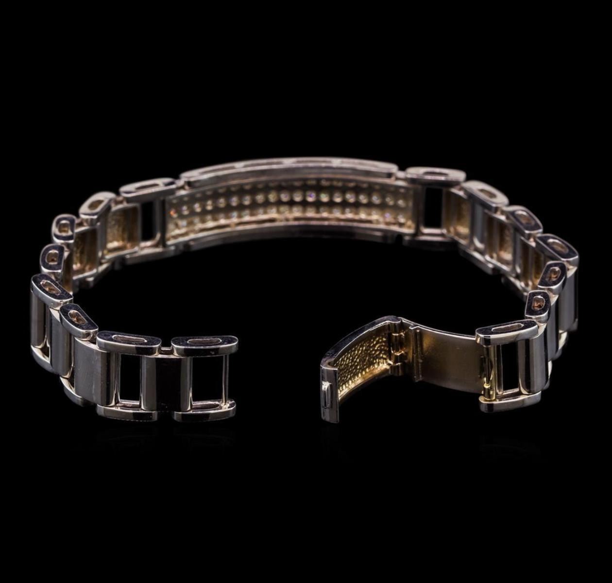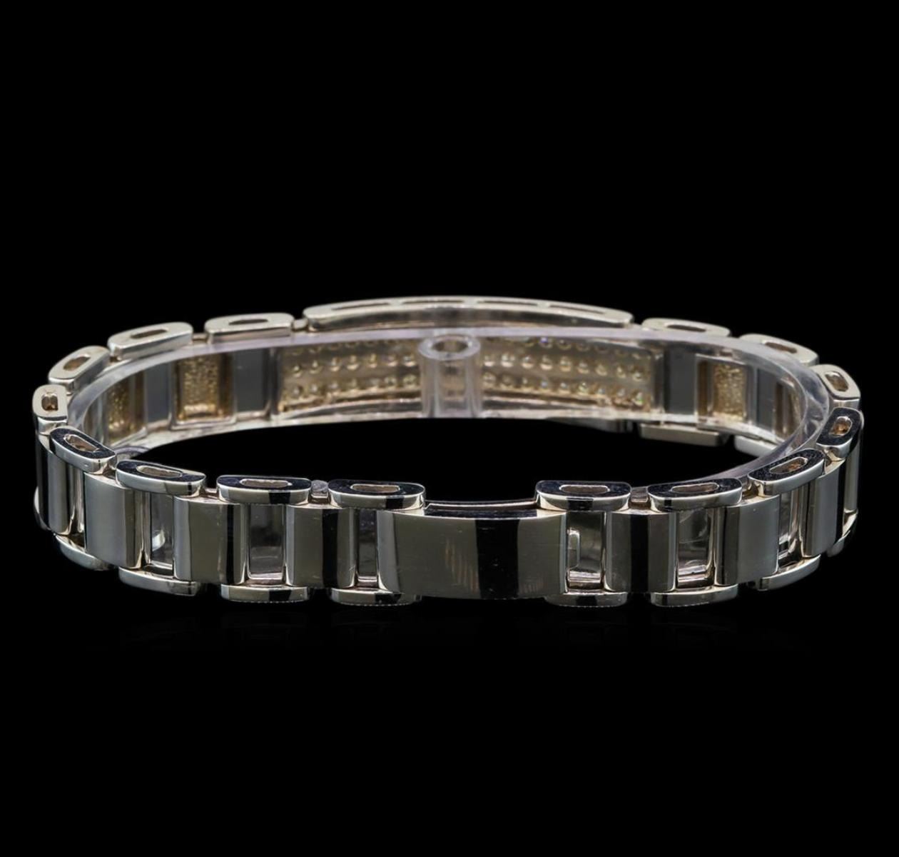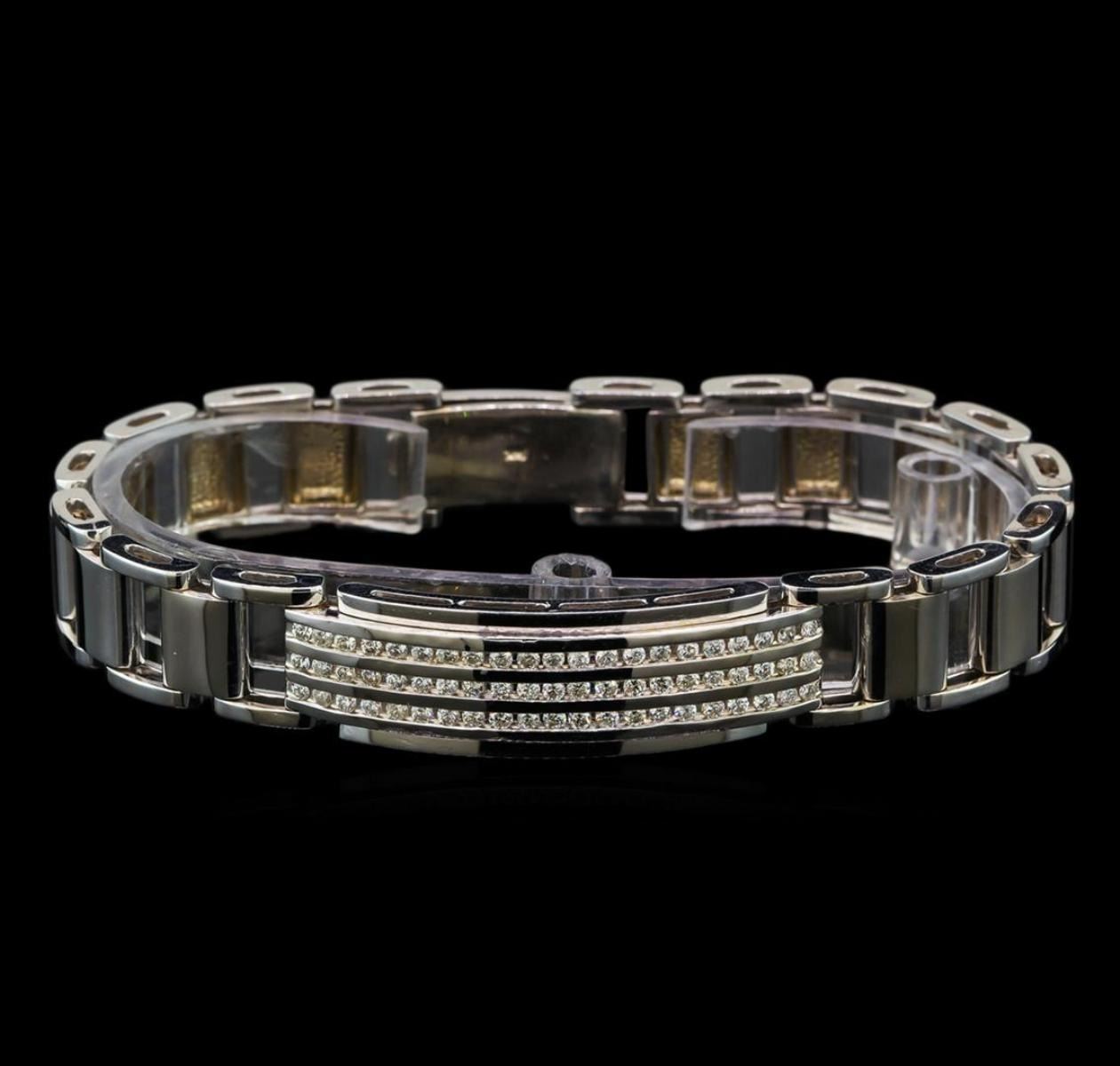 One electronically tested 14KT white gold cast & assembled diamond bracelet. Seven and one-half inch wearable length bracelet features a plate inlaid with three parallel diamond ribbons transitioning into white gold links, terminating in a fold over link clasp. Bright polish finish. Identified with markings of '14K'. Condition is good. Containing: Sixty-Three channel set round brilliant cut diamonds, measuring 1.80 - 1.80 x 1.08mm (depth est.) approximate total weight of 63 Stones = 1.44ct. Graded in the setting. Clarity SI-2 to I-2. Color: G - I. Total Weight of Diamonds 1.44ct.. Total Weight of Bracelet 40.64gm. AIG Appraised.