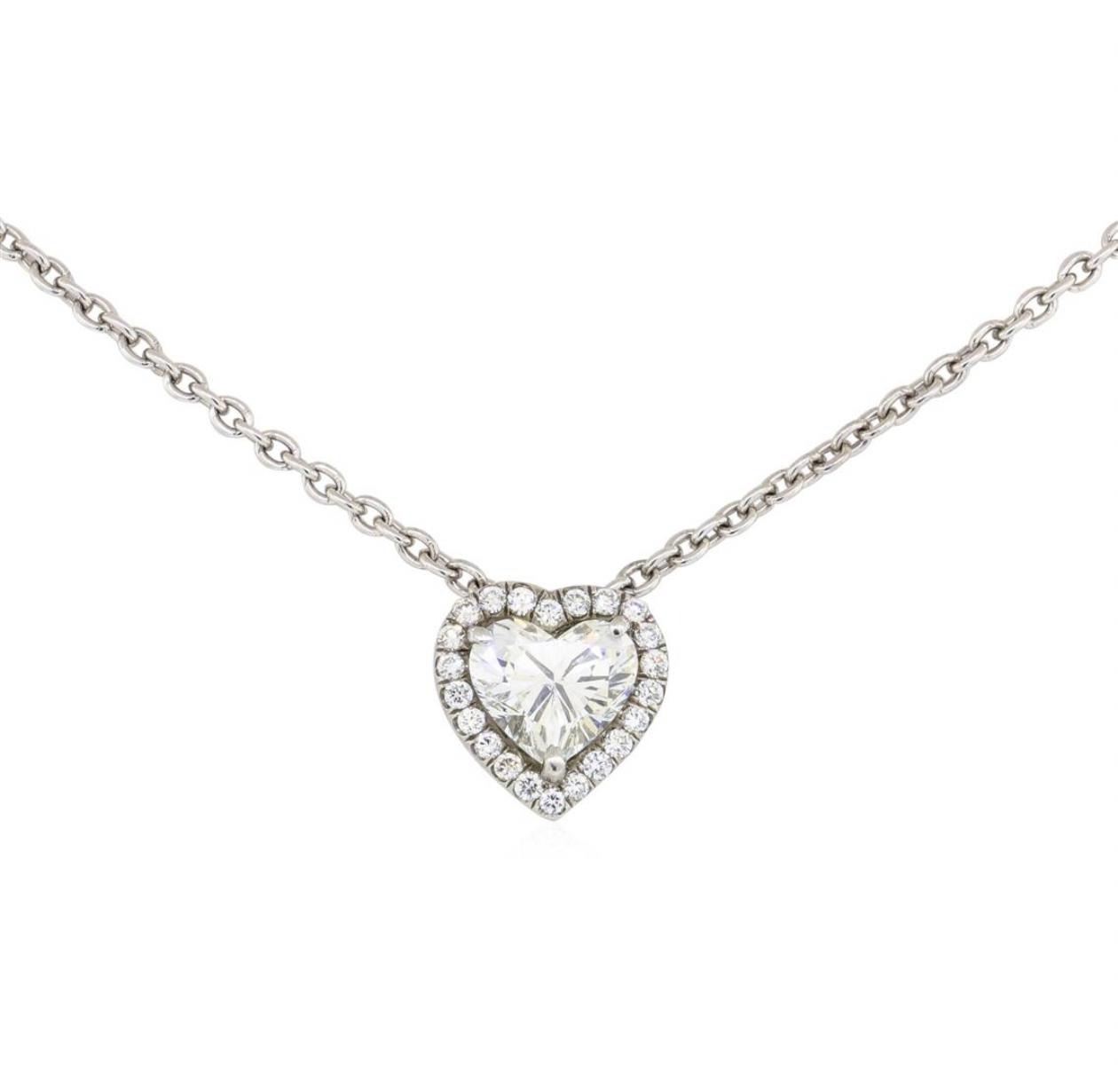 One electronically tested platinum lady's combination cast & assembled fashion heart shape pendant & chain 16.0' long, 1.6mm oval cable link with a lobster claw clasp with a bright polish finish. Identified with markings of 'PT 950'. Condition is new, good workmanship. Containing: One prong set heart shaped cut diamond, measuring 7.20 x 6.50 x 4.48mm (depth est.) approximate weight of 1.24ct. Graded in the setting. Color I Clarity SI-1 Cut Good Twenty-Two prong set round brilliant cut diamonds, measuring 1.30 - 1.25 x 0.79mm (depth est.) approximate total weight of 22 Stones = 0.20 ct. Graded in the setting. Color G - H Clarity VS-2 to SI-1 Cut Very Good. Total Weight of Diamonds 1.44ct.. Total Weight of Pendant & Chain 7.40gm GAS Appraised at $11540.00. GAS Appraised.
