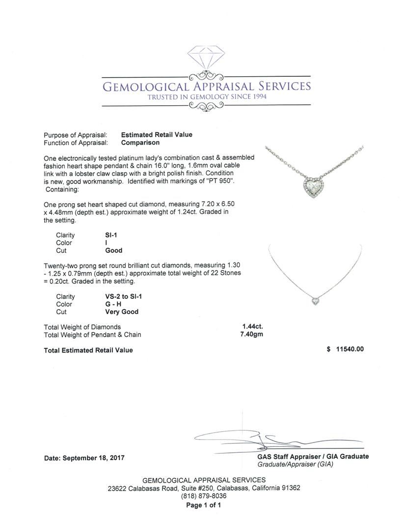 One electronically tested platinum lady's combination cast & assembled fashion heart shape pendant & chain 16.0' long, 1.6mm oval cable link with a lobster claw clasp with a bright polish finish. Identified with markings of 'PT 950'. Condition is new, good workmanship. Containing: One prong set heart shaped cut diamond, measuring 7.20 x 6.50 x 4.48mm (depth est.) approximate weight of 1.24ct. Graded in the setting. Color I Clarity SI-1 Cut Good Twenty-Two prong set round brilliant cut diamonds, measuring 1.30 - 1.25 x 0.79mm (depth est.) approximate total weight of 22 Stones = 0.20 ct. Graded in the setting. Color G - H Clarity VS-2 to SI-1 Cut Very Good. Total Weight of Diamonds 1.44ct.. Total Weight of Pendant & Chain 7.40gm GAS Appraised at $11540.00. GAS Appraised.