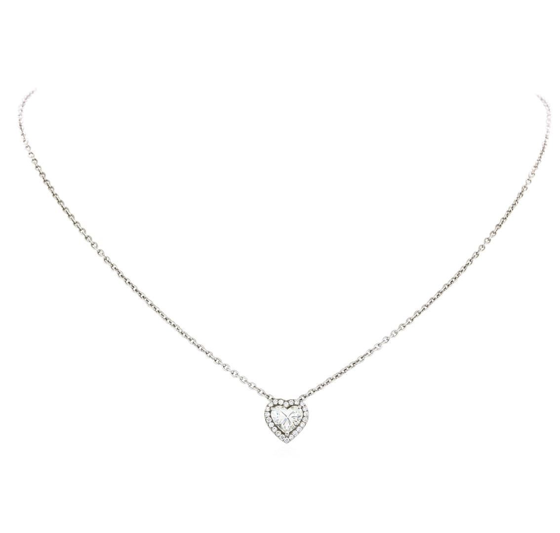One electronically tested platinum lady's combination cast & assembled fashion heart shape pendant & chain 16.0' long, 1.6mm oval cable link with a lobster claw clasp with a bright polish finish. Identified with markings of 'PT 950'. Condition is new, good workmanship. Containing: One prong set heart shaped cut diamond, measuring 7.20 x 6.50 x 4.48mm (depth est.) approximate weight of 1.24ct. Graded in the setting. Color I Clarity SI-1 Cut Good Twenty-Two prong set round brilliant cut diamonds, measuring 1.30 - 1.25 x 0.79mm (depth est.) approximate total weight of 22 Stones = 0.20 ct. Graded in the setting. Color G - H Clarity VS-2 to SI-1 Cut Very Good. Total Weight of Diamonds 1.44ct.. Total Weight of Pendant & Chain 7.40gm GAS Appraised at $11540.00. GAS Appraised.