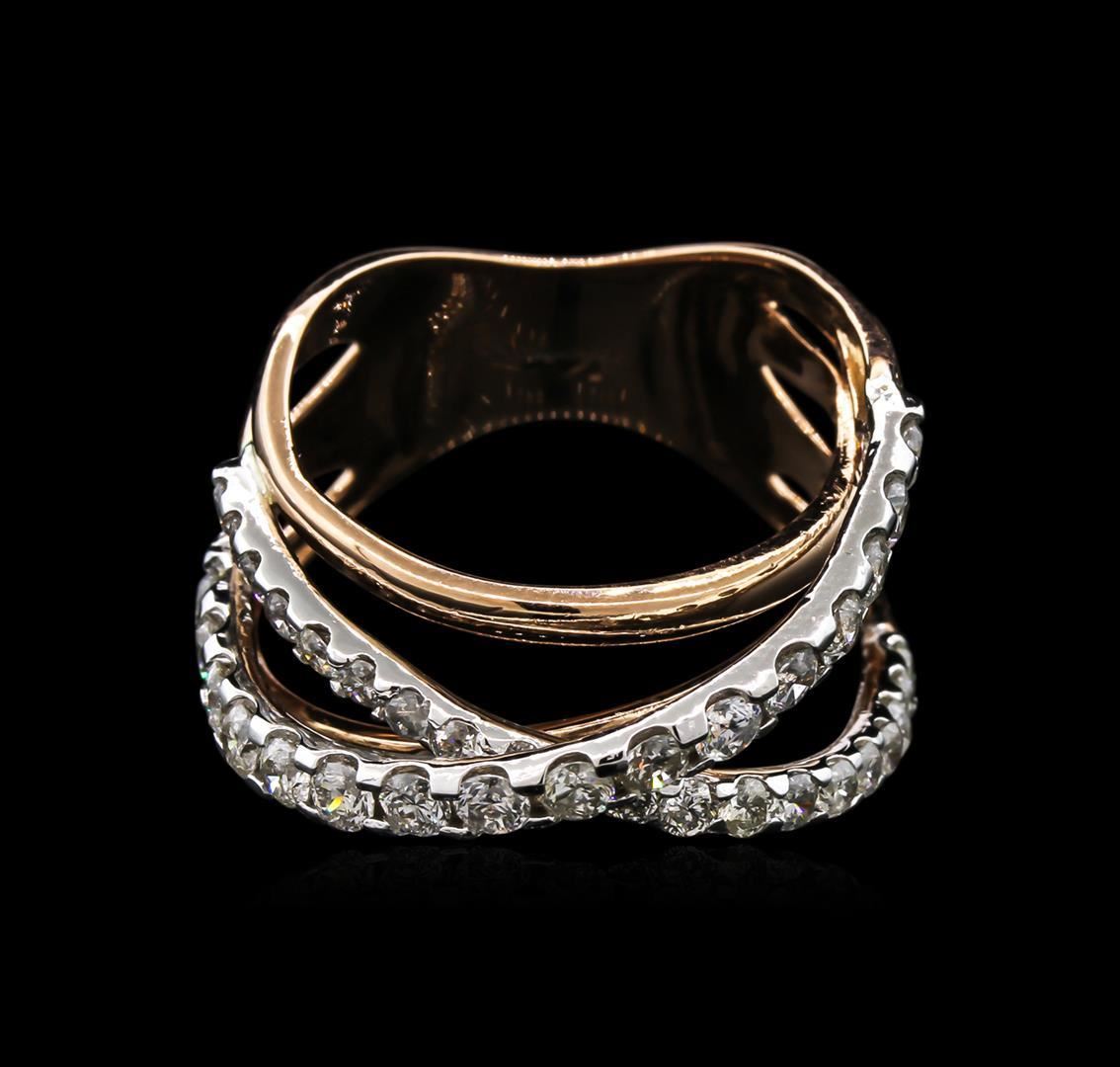 One electronically tested 14KT rose gold lady's combination cast & assembled fashion ring with a bright polish finish. The featured lady's ring has a four row crossover motif with two rows being diamond encrusted, and a shank measuring 7 millimeters in width. Identified with markings of "14K". Condition is new, good workmanship. Containing: Sixteen prong set round brilliant cut diamonds, measuring 2.40 - 2.30 x 1.53mm (depth est.) approximate total weight of 16 Stones = 0.85ct. Graded in the setting. Clarity: SI-2 to I-1. Color: H - I. Cut Good Twenty prong set round brilliant cut diamonds, measuring 2.00 - 1.90 x 1.27mm (depth est.) approximate total weight of 20 Stones = 0.59ct. Graded in the setting. Clarity: SI-2 to I-1. Color: H - I. Cut Good. Total Weight of Diamonds 1.44ct. Total Weight of Ring 5.70gm at $4240.00.. GAS Appraised.
