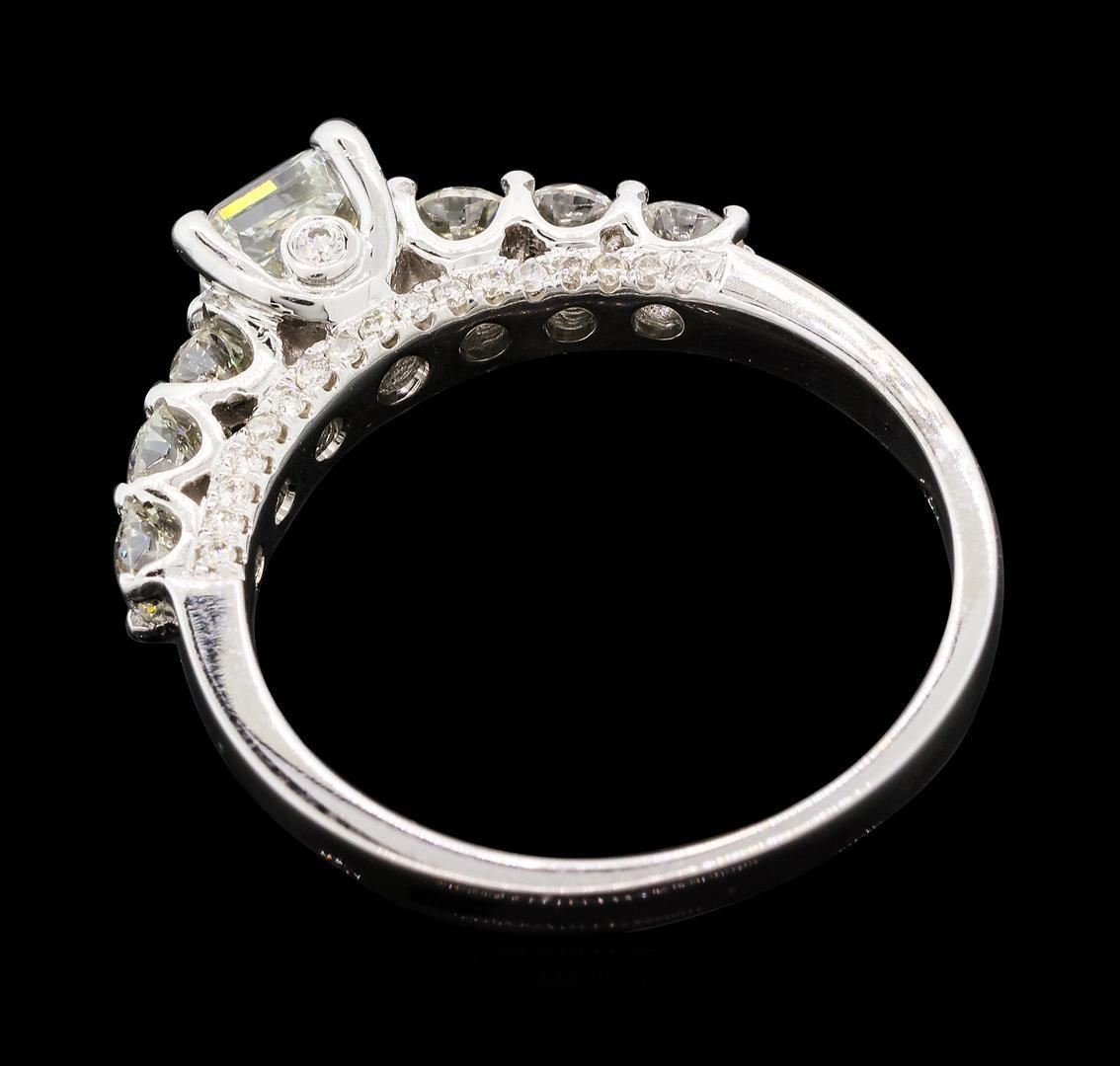 One electronically tested 14KT white gold lady's cast wedding ring with a bright polish finish. The featured lady's ring has a shank measuring 2.00 millimeters wide. Identified with markings of '14K'. Condition is new, good workmanship. Containing: One prong set princess cut diamond, measuring 4.78 x 4.60 x 3.46mm (depth est.) , 10.00.%. GTCF approximate weight of 0.72ct. The featured princess cut diamond has cut corners. Graded in the setting. Color H - I Clarity SI-1 Cut Good Six prong set round brilliant cut diamonds, measuring 2.90 - 2.80 x 1.77mm (depth est.) approximate total weight of 6 Stones = 0.53ct. Graded in the setting. Color H - I Clarity VS-2 to SI-1 Cut Very Good Two bezel set round brilliant cut diamonds, measuring 1.50 - 1.40 x 0.90mm (depth est.) approximate total weight of 2 Stones = 0.02ct. Graded in the setting. Color H - I Clarity SI-1 Cut Good Thirty-Four prong set round brilliant cut diamonds, measuring 1.15 - 1.05 x 0.68mm (depth est.) approximate total weight of 34 Stones = 0.17ct. Graded in the setting. Color H - I Clarity SI-1 to I-1 Cut Good. Total Weight of Diamonds 1.44ct.. Total Weight of Ring 3.40gm GAS Appraised.