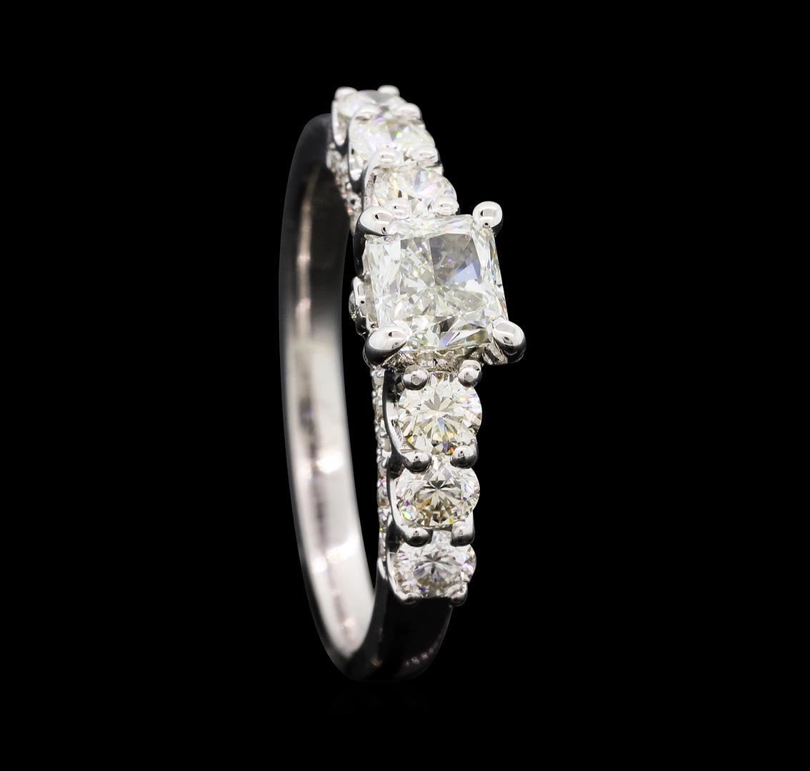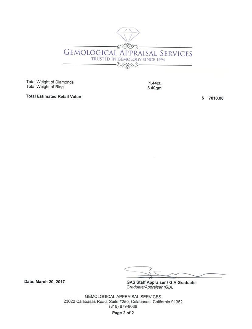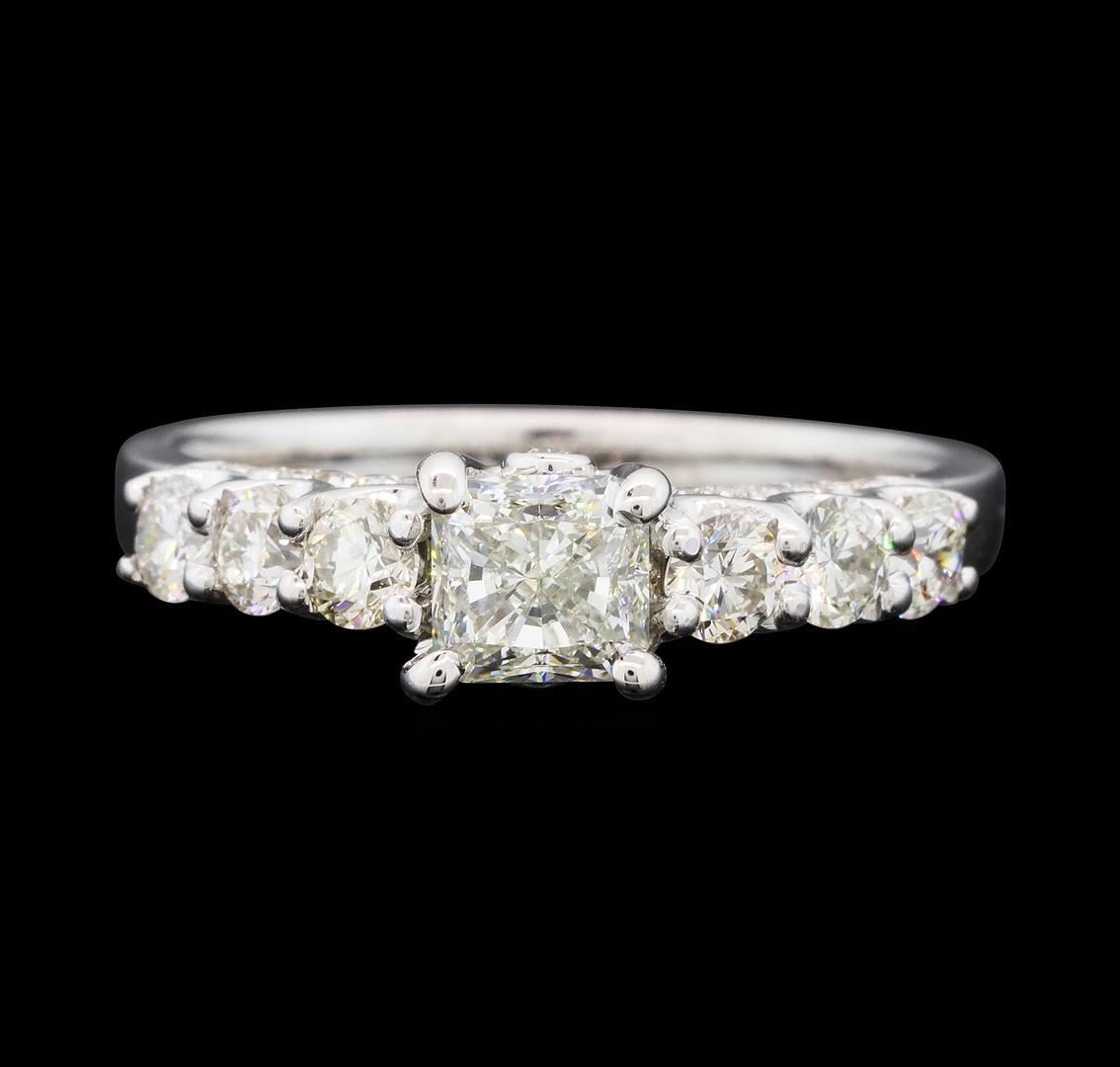 One electronically tested 14KT white gold lady's cast wedding ring with a bright polish finish. The featured lady's ring has a shank measuring 2.00 millimeters wide. Identified with markings of '14K'. Condition is new, good workmanship. Containing: One prong set princess cut diamond, measuring 4.78 x 4.60 x 3.46mm (depth est.) , 10.00.%. GTCF approximate weight of 0.72ct. The featured princess cut diamond has cut corners. Graded in the setting. Color H - I Clarity SI-1 Cut Good Six prong set round brilliant cut diamonds, measuring 2.90 - 2.80 x 1.77mm (depth est.) approximate total weight of 6 Stones = 0.53ct. Graded in the setting. Color H - I Clarity VS-2 to SI-1 Cut Very Good Two bezel set round brilliant cut diamonds, measuring 1.50 - 1.40 x 0.90mm (depth est.) approximate total weight of 2 Stones = 0.02ct. Graded in the setting. Color H - I Clarity SI-1 Cut Good Thirty-Four prong set round brilliant cut diamonds, measuring 1.15 - 1.05 x 0.68mm (depth est.) approximate total weight of 34 Stones = 0.17ct. Graded in the setting. Color H - I Clarity SI-1 to I-1 Cut Good. Total Weight of Diamonds 1.44ct.. Total Weight of Ring 3.40gm GAS Appraised.