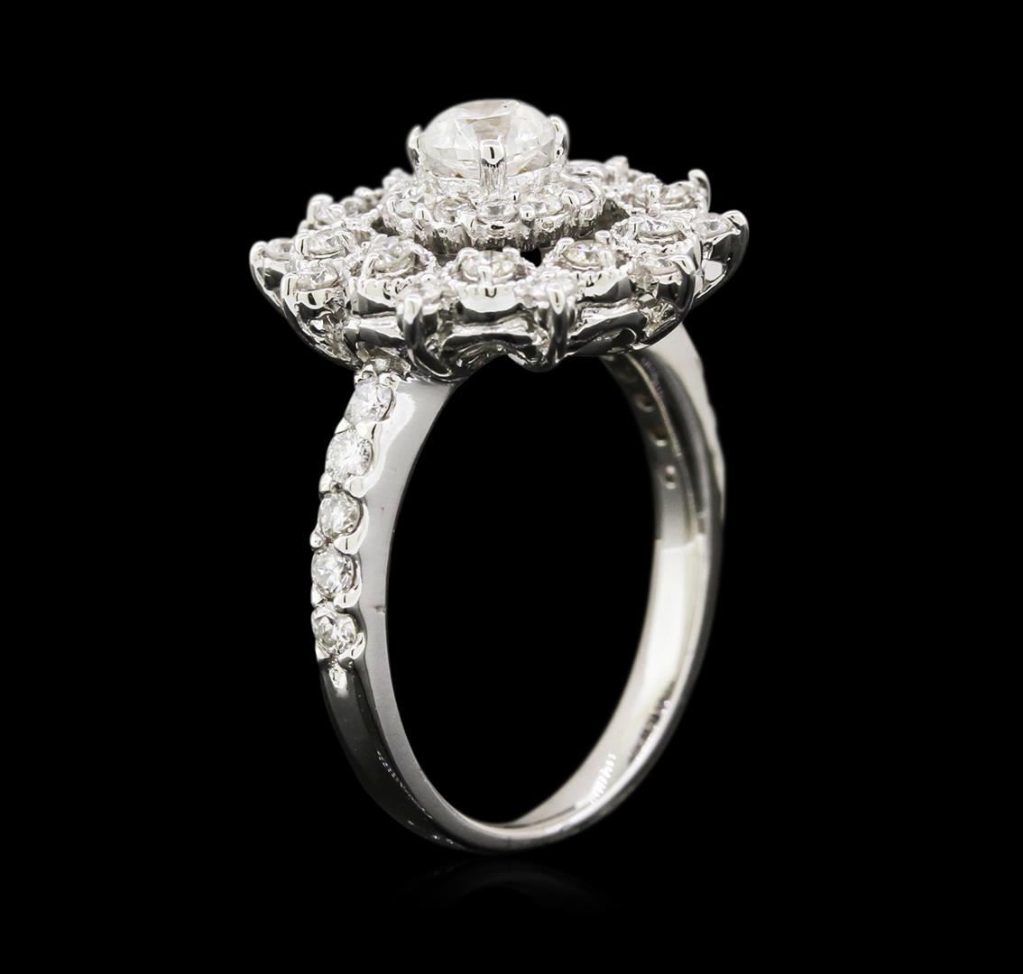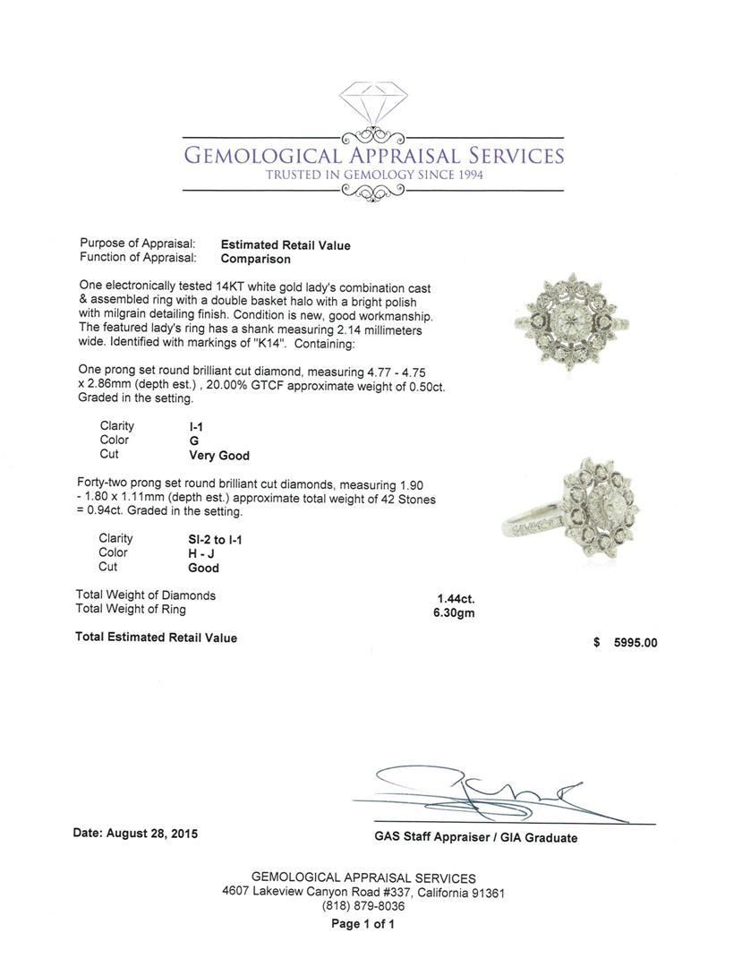One electronically tested 14KT white gold lady's combination cast & assembled ring with a double basket halo with a bright polish with milgrain detailing finish. The featured lady's ring has a shank measuring 2.14 millimeters wide. Identified with markings of "K14". Condition is new, good workmanship. Containing: One prong set round brilliant cut diamond, measuring 4.77 - 4.75 x 2.86mm (depth est.) , 20.00.%. GTCF approximate weight of 0.50ct. Graded in the setting. Clarity: I-1. Color: G. Cut Very Good Forty-Two prong set round brilliant cut diamonds, measuring 1.90 - 1.80 x 1.11mm (depth est.) approximate total weight of 42 Stones = 0.94ct. Graded in the setting. Clarity: SI-2 to I-1. Color: H - Good. Total Weight of Diamonds 1.44ct. Total Weight of Ring 6.30gm. GAS Appraised.