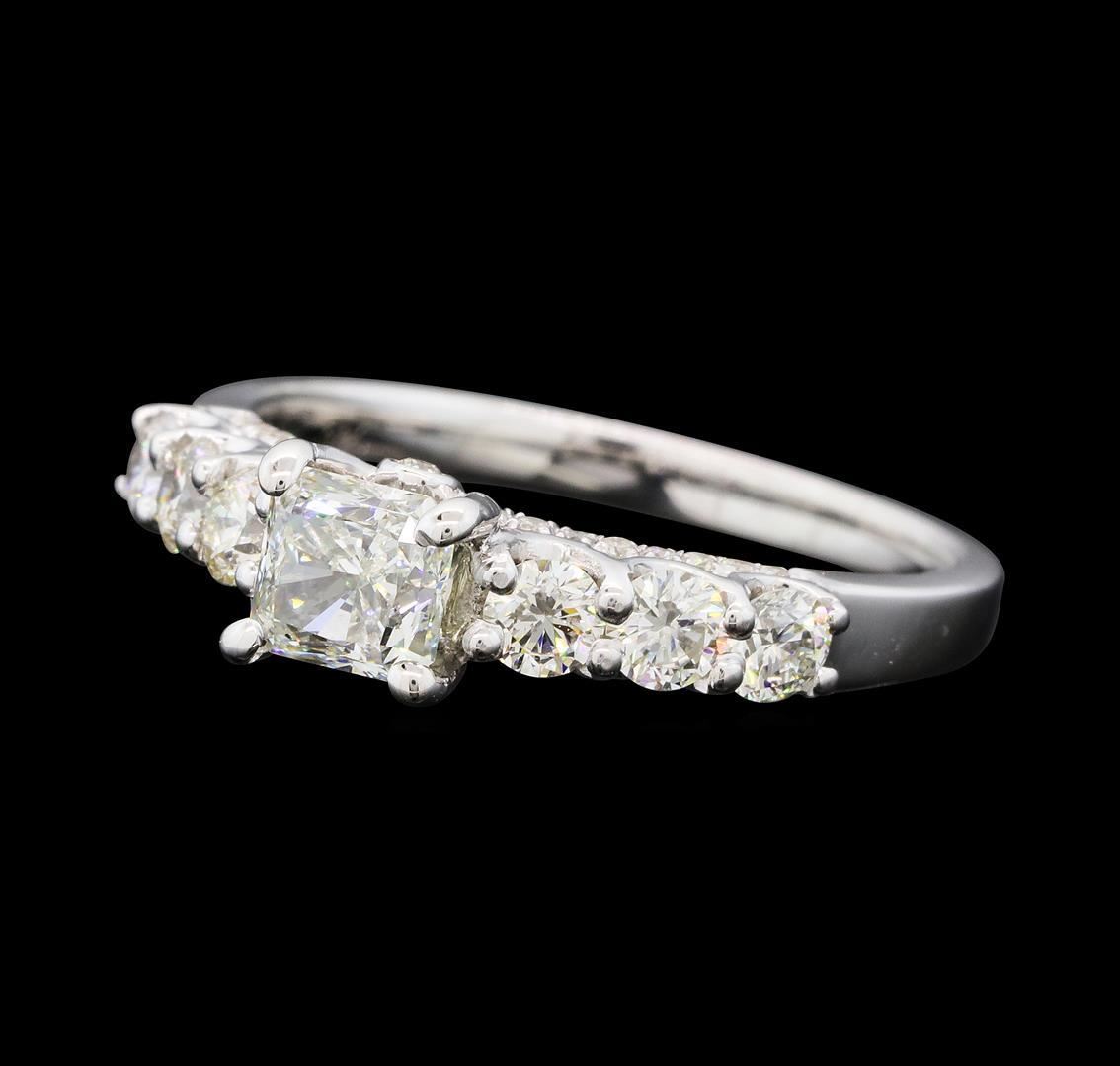 One electronically tested 14KT white gold lady's cast wedding ring with a bright polish finish. The featured lady's ring has a shank measuring 2.00 millimeters wide. Identified with markings of '14K'. Condition is new, good workmanship. Containing: One prong set princess cut diamond, measuring 4.78 x 4.60 x 3.46mm (depth est.) , 10.00.%. GTCF approximate weight of 0.72ct. The featured princess cut diamond has cut corners. Graded in the setting. Color H - I Clarity SI-1 Cut Good Six prong set round brilliant cut diamonds, measuring 2.90 - 2.80 x 1.77mm (depth est.) approximate total weight of 6 Stones = 0.53ct. Graded in the setting. Color H - I Clarity VS-2 to SI-1 Cut Very Good Two bezel set round brilliant cut diamonds, measuring 1.50 - 1.40 x 0.90mm (depth est.) approximate total weight of 2 Stones = 0.02ct. Graded in the setting. Color H - I Clarity SI-1 Cut Good Thirty-Four prong set round brilliant cut diamonds, measuring 1.15 - 1.05 x 0.68mm (depth est.) approximate total weight of 34 Stones = 0.17ct. Graded in the setting. Color H - I Clarity SI-1 to I-1 Cut Good. Total Weight of Diamonds 1.44ct.. Total Weight of Ring 3.40gm GAS Appraised.